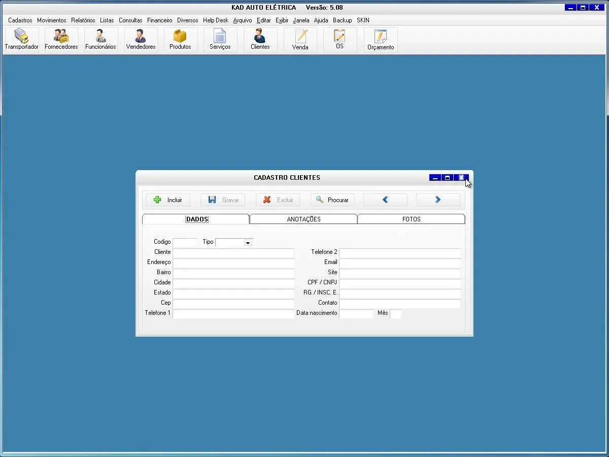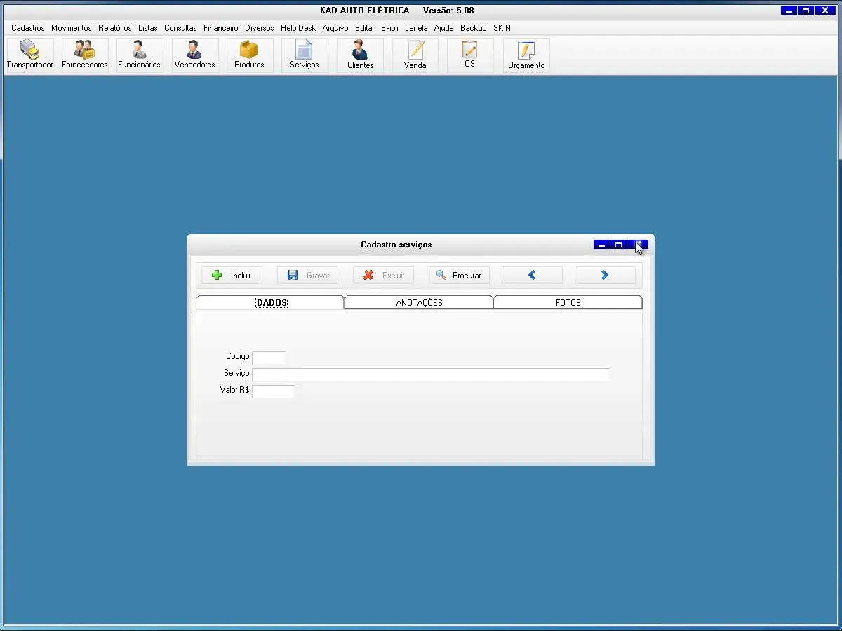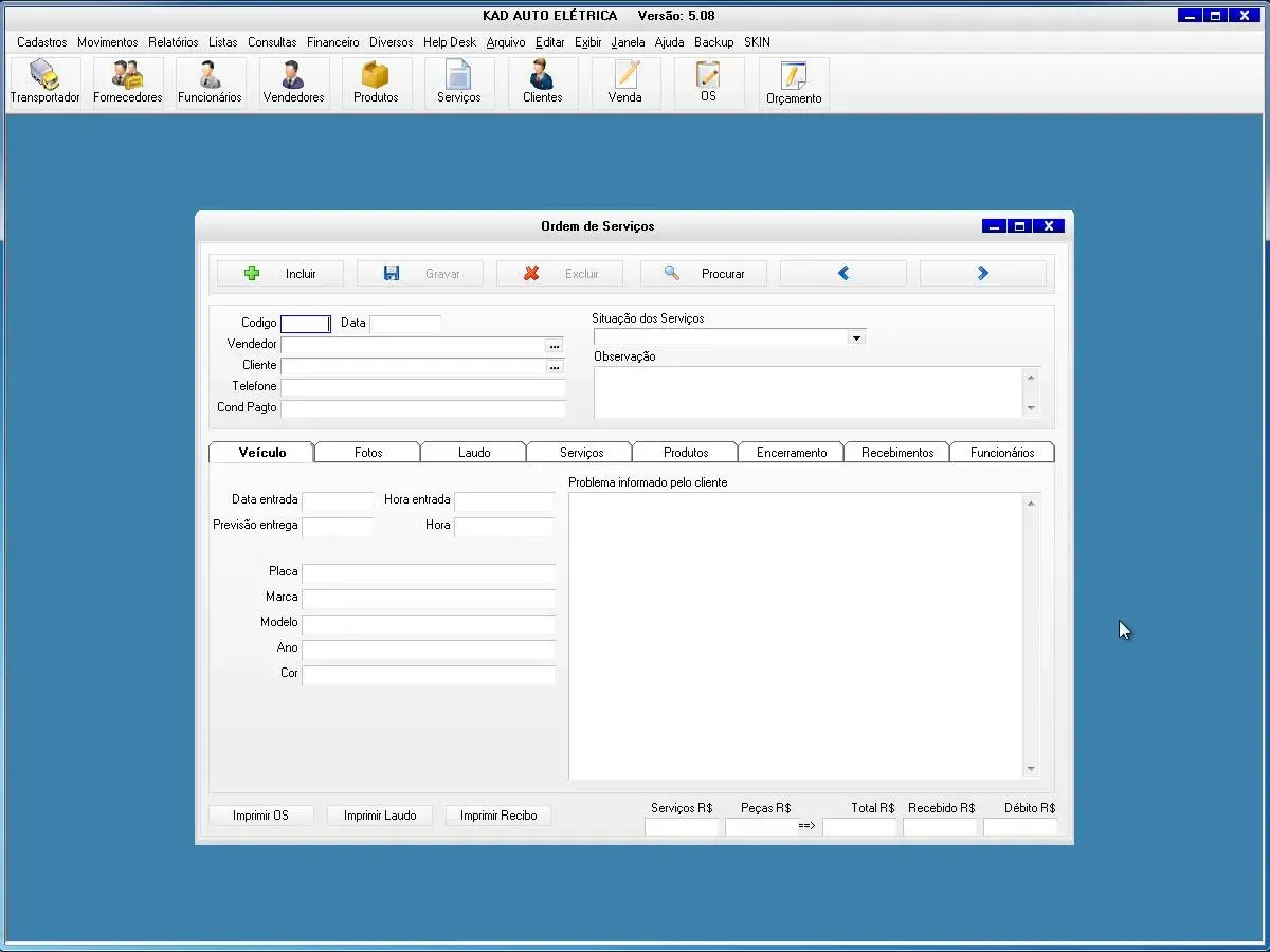 O programa para auto elétrica possibilita o cadastro completo da ordem de serviços
