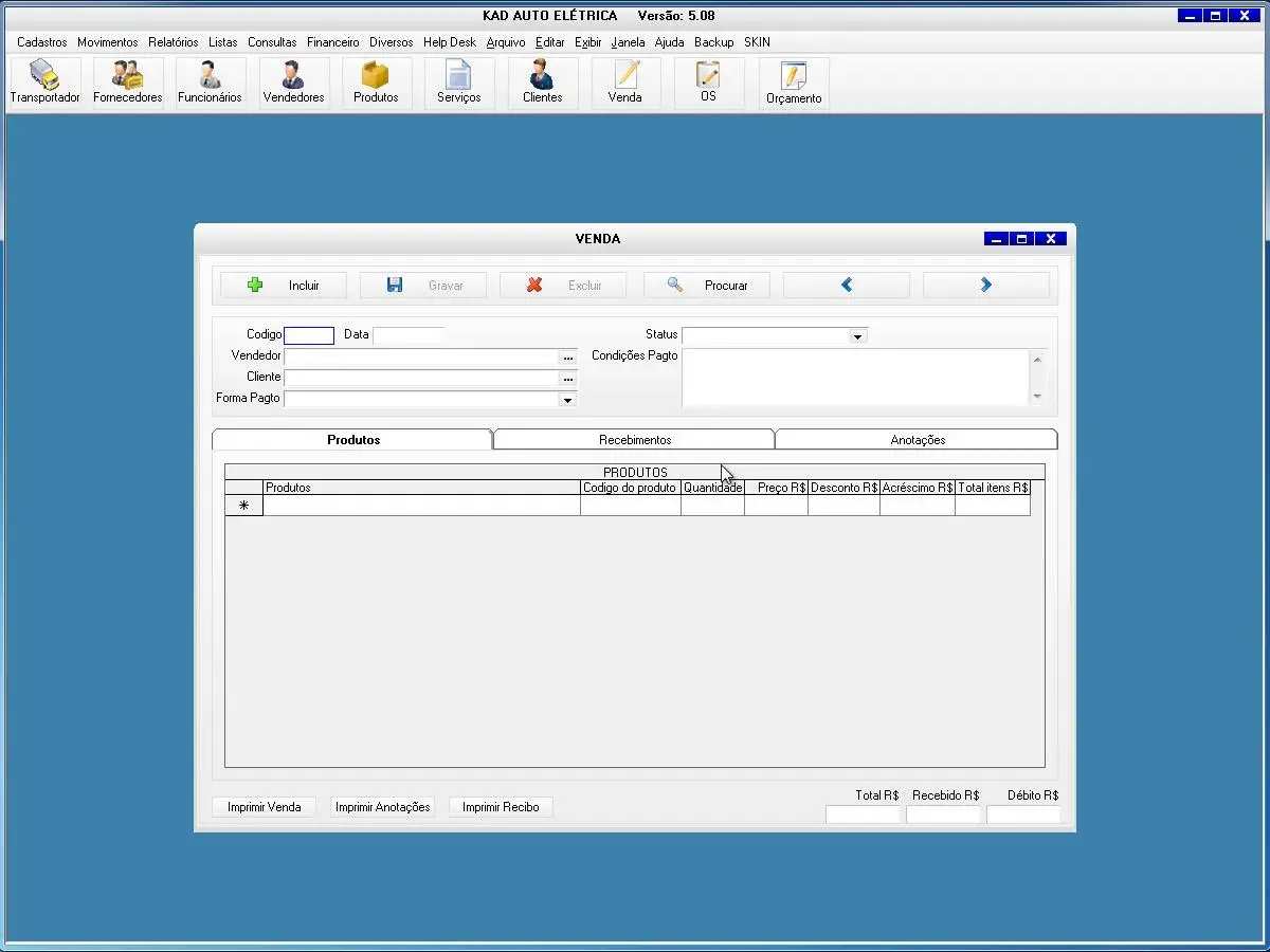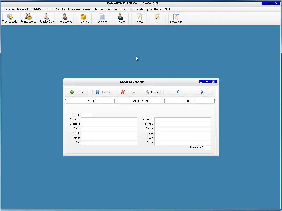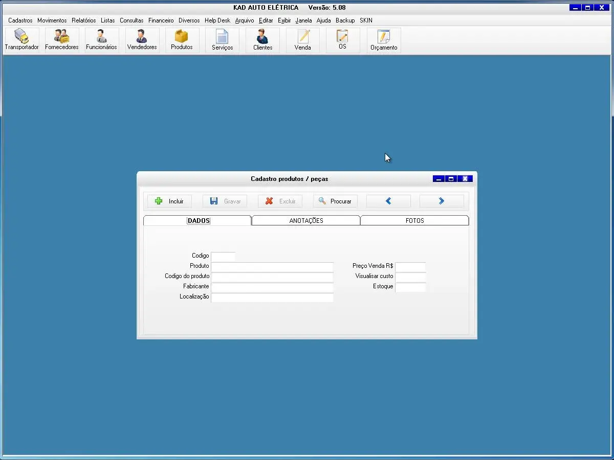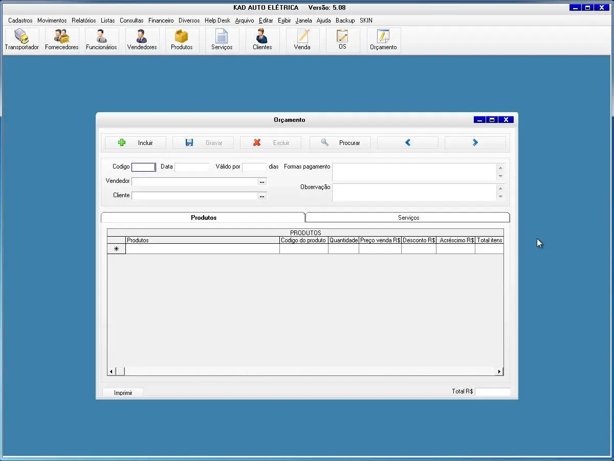 O software para auto elétrica possui cadastro de venda, ordem de serviços e orçamentos.