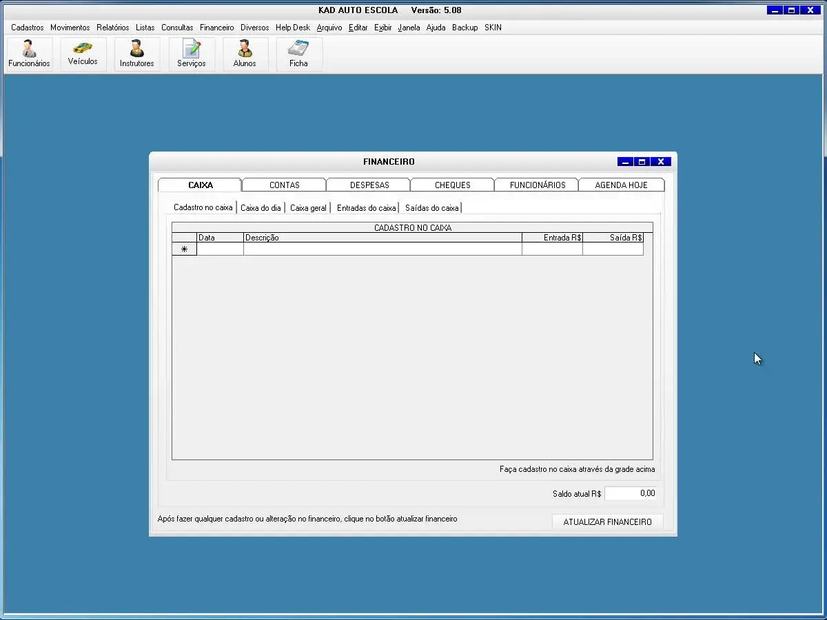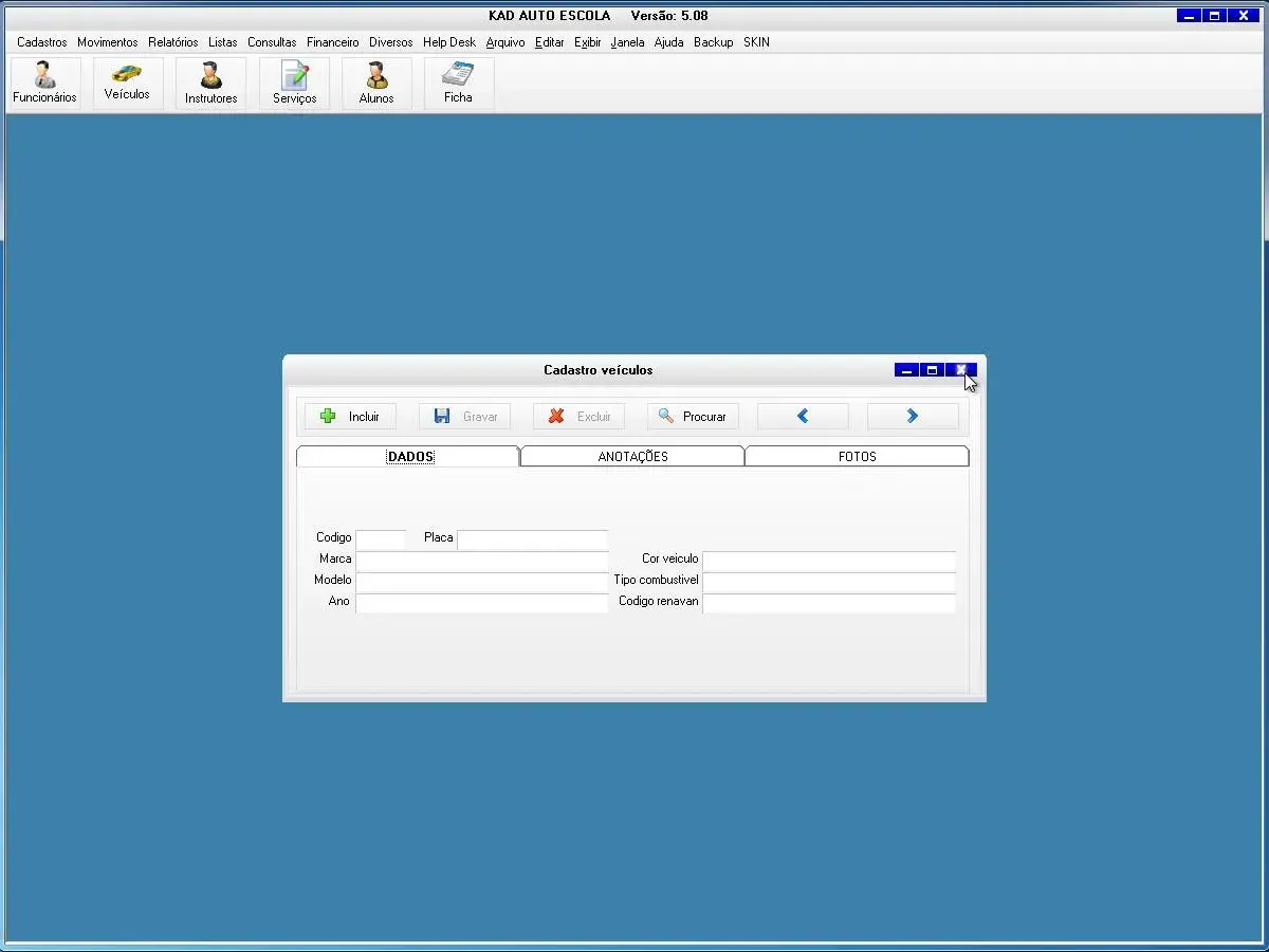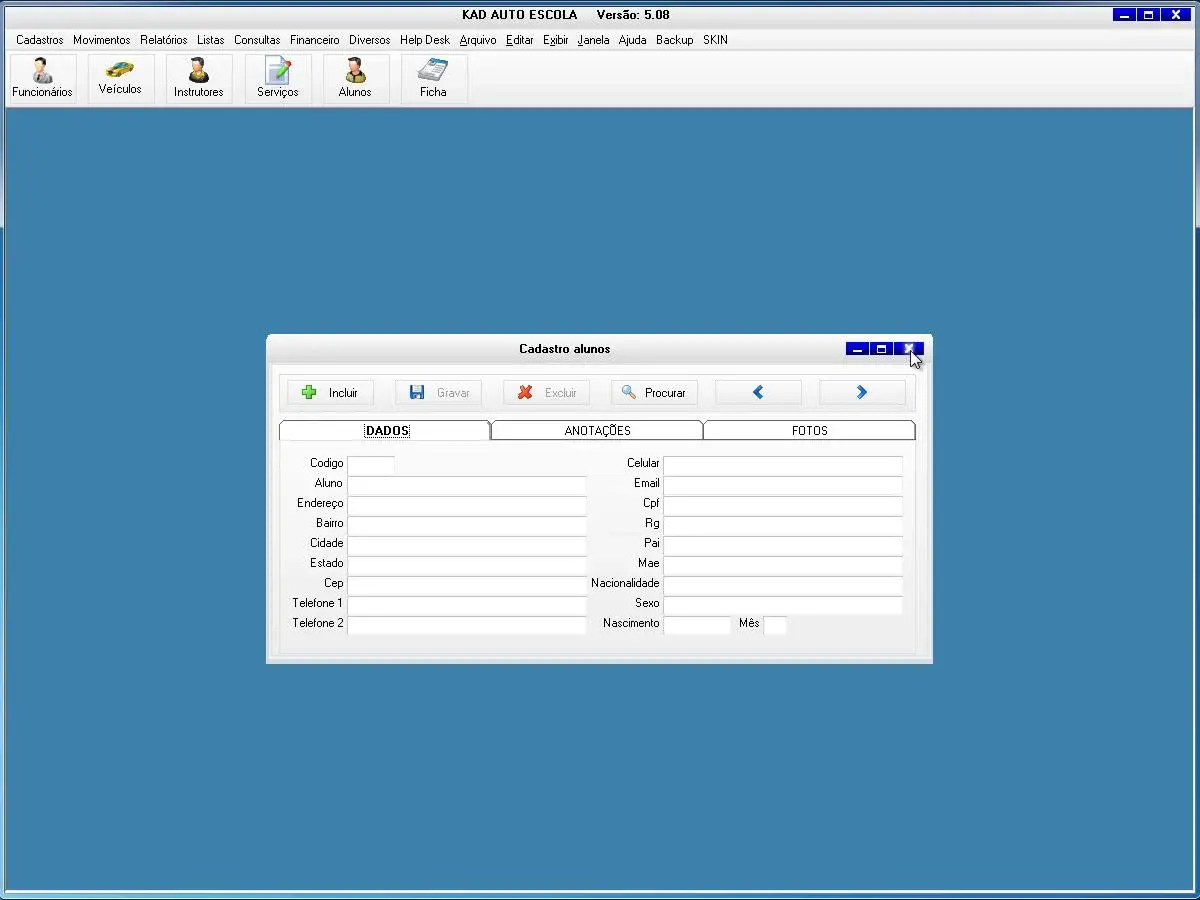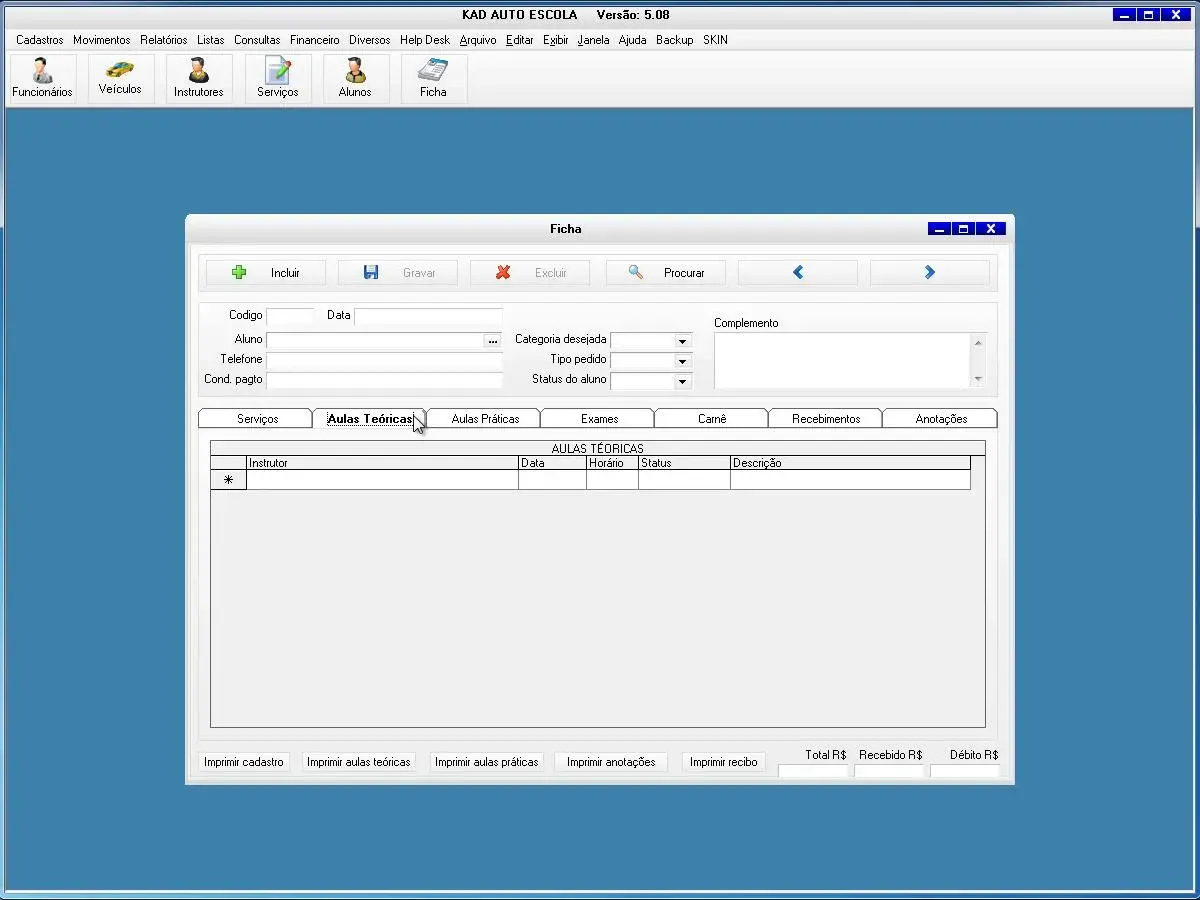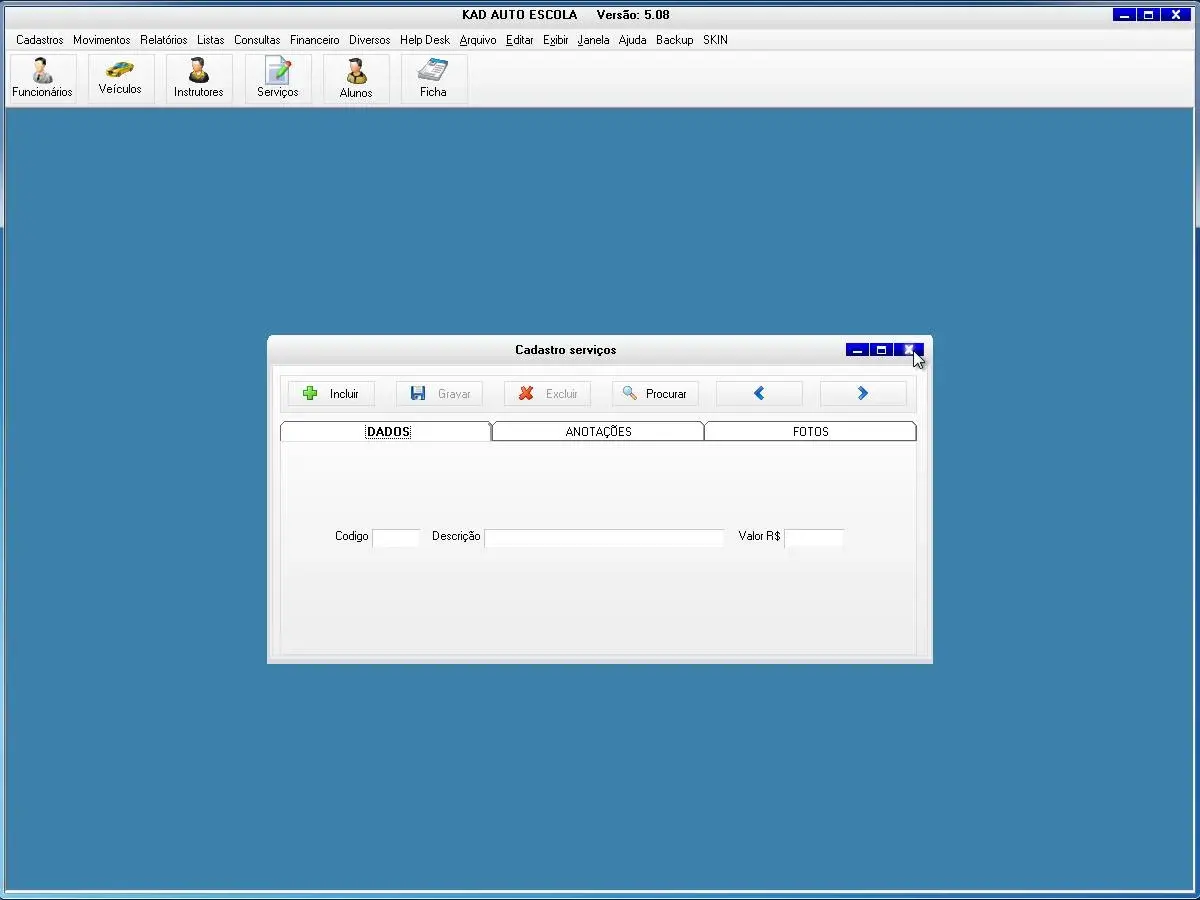 O sistema para auto escola possui tela de cadastro de valores dos serviços, carnês, parcelas, recebimentos e outros