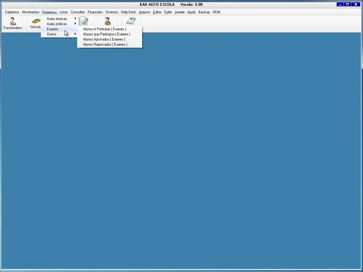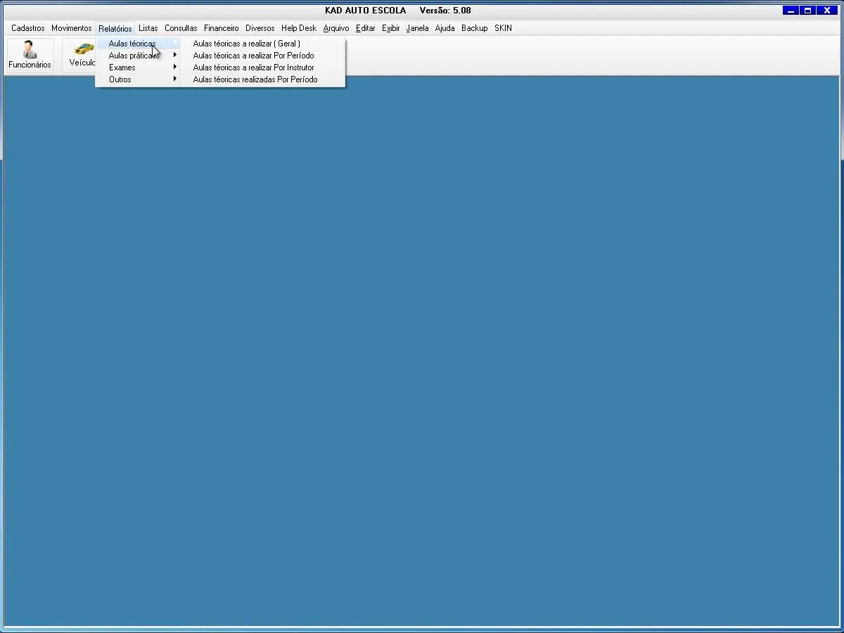 aulas teóricas, aulas práticas, exames, contas a receber, carnês, vendas, aniversariantes