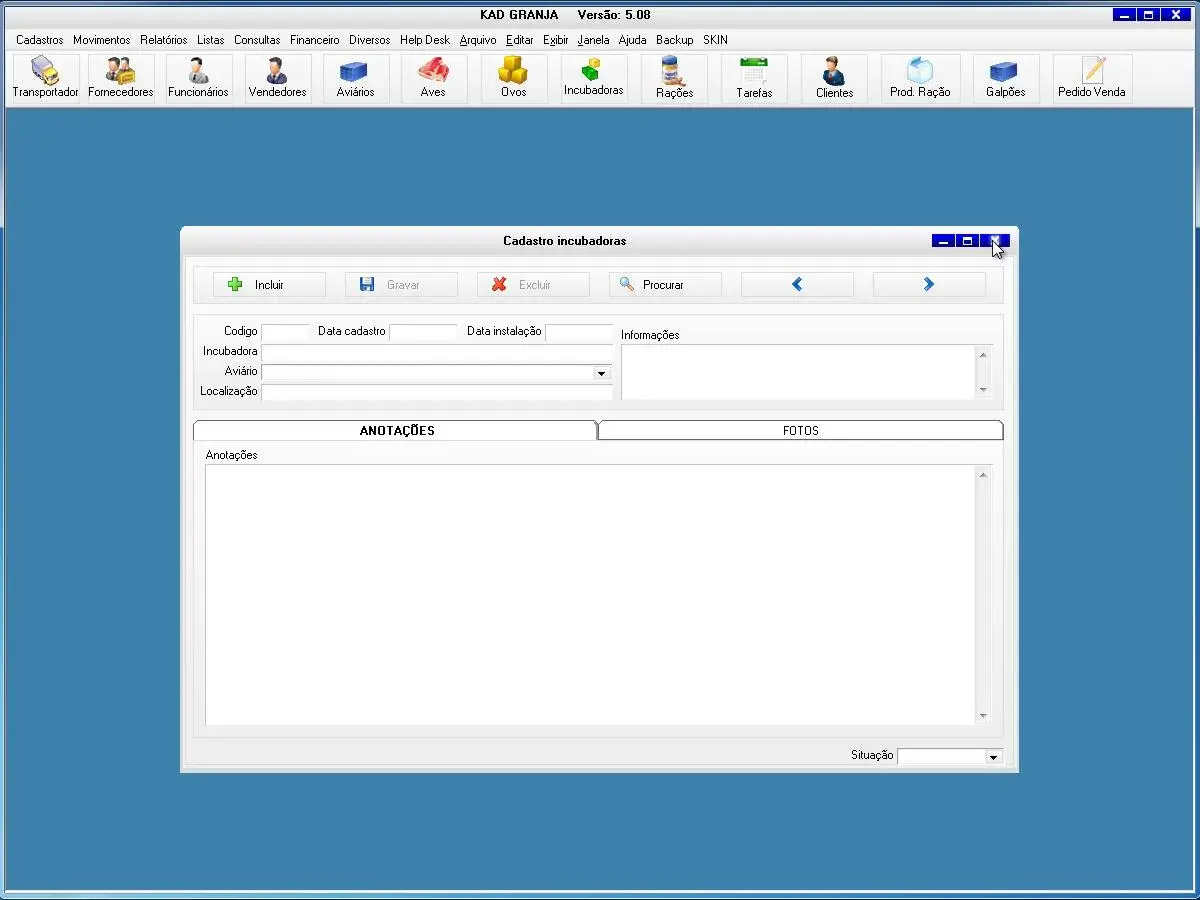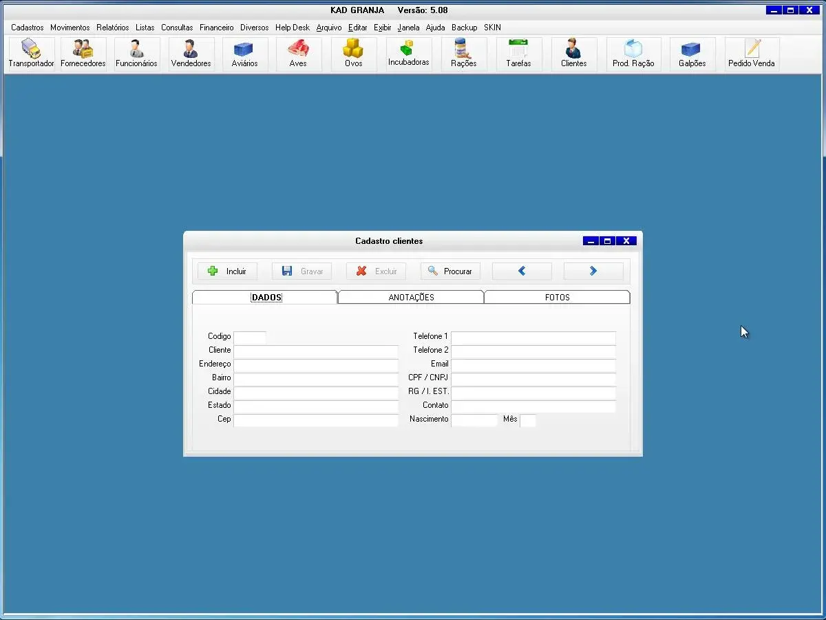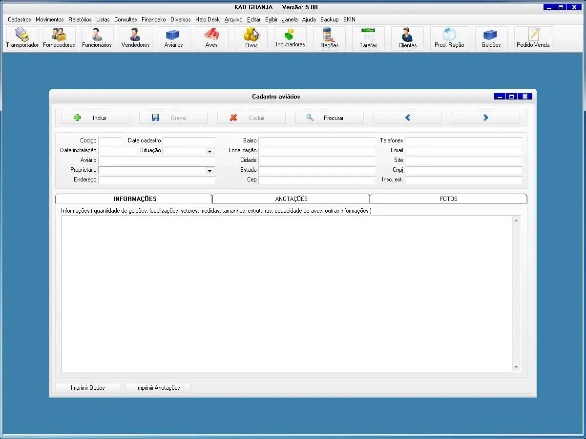 transportadoras, fornecedores, funcionários, vendedores, proprietários, aviários, equipamentos, obras, aves, rações, produtos, incubadoras, contatos, clientes, tarefas
