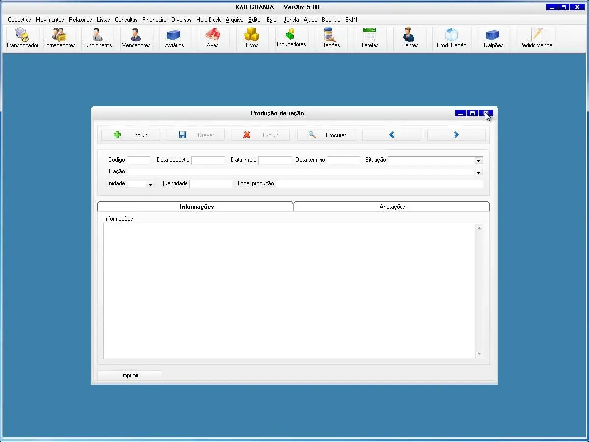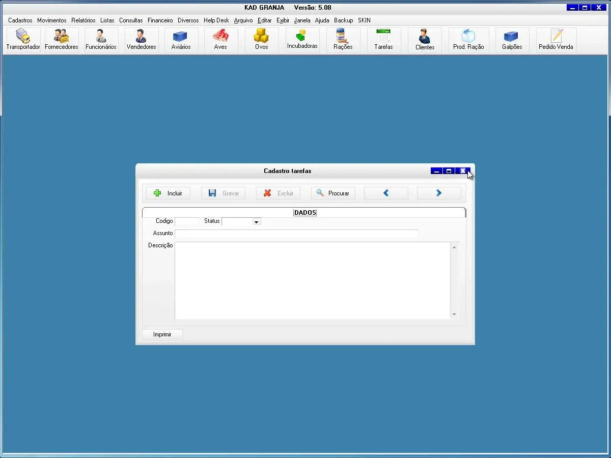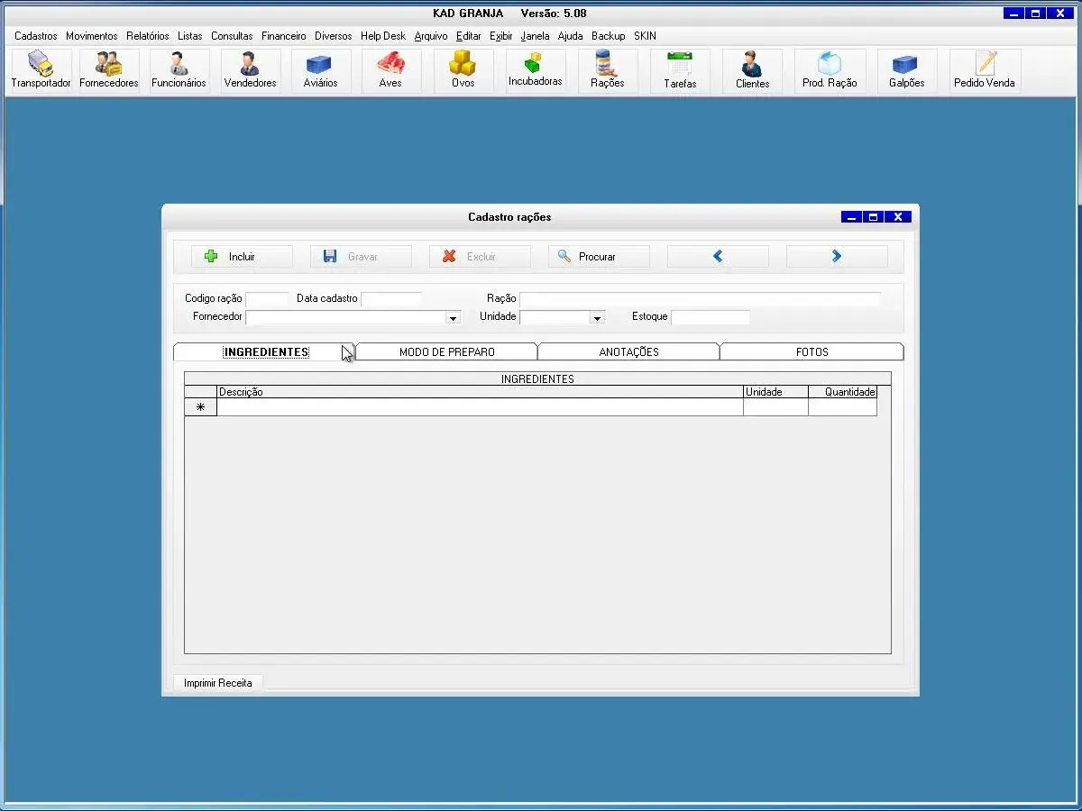 transportadoras, fornecedores, funcionários, vendedores, proprietários, aviários, equipamentos, obras, aves, rações, produtos, incubadoras, contatos, clientes, tarefas