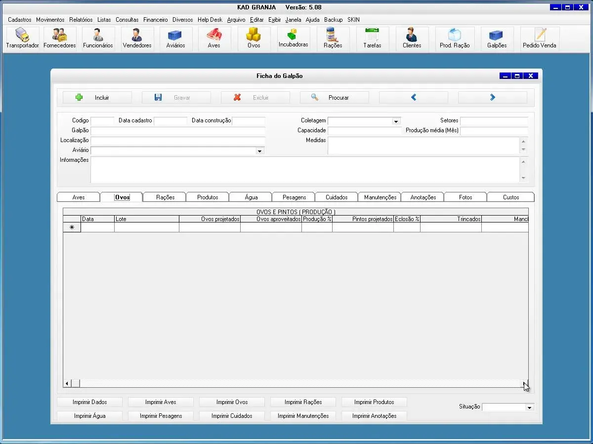 O software para avicultura possui Ficha do Galpão para cadastrar informações da produção