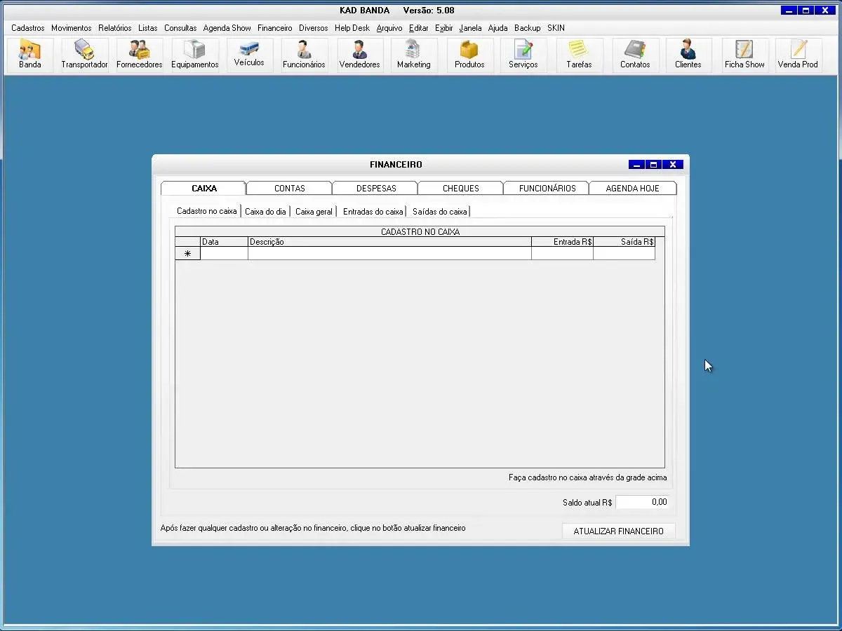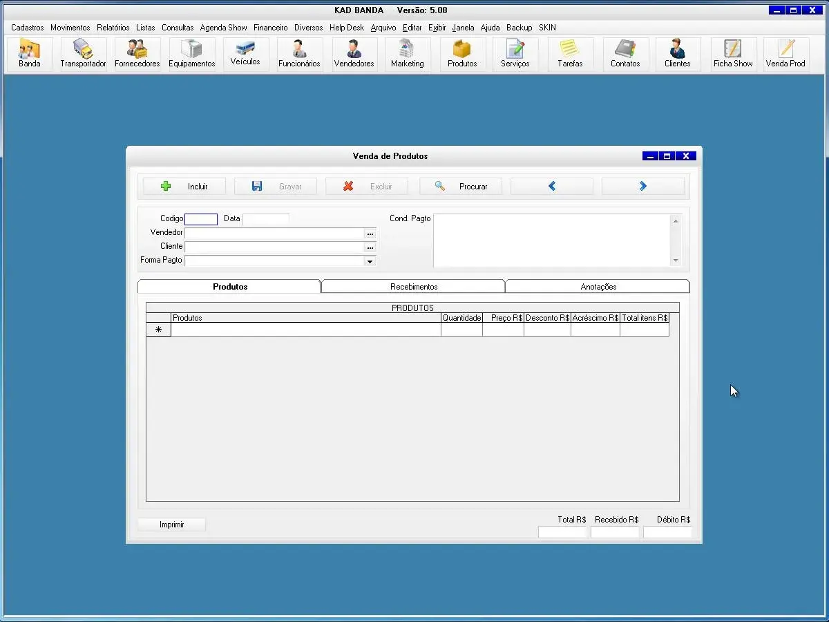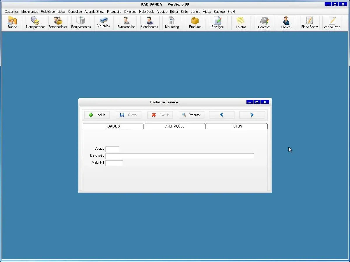 O programa para banda possui tela para cadastros de shows e valores