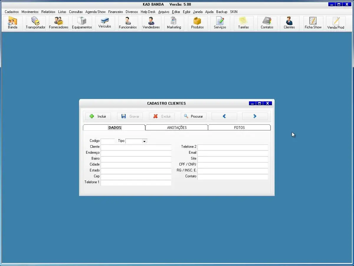 O sistema para banda possui Ficha de Show para cadastro de várias informações do show