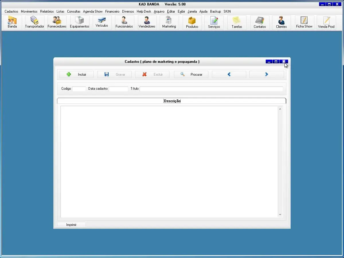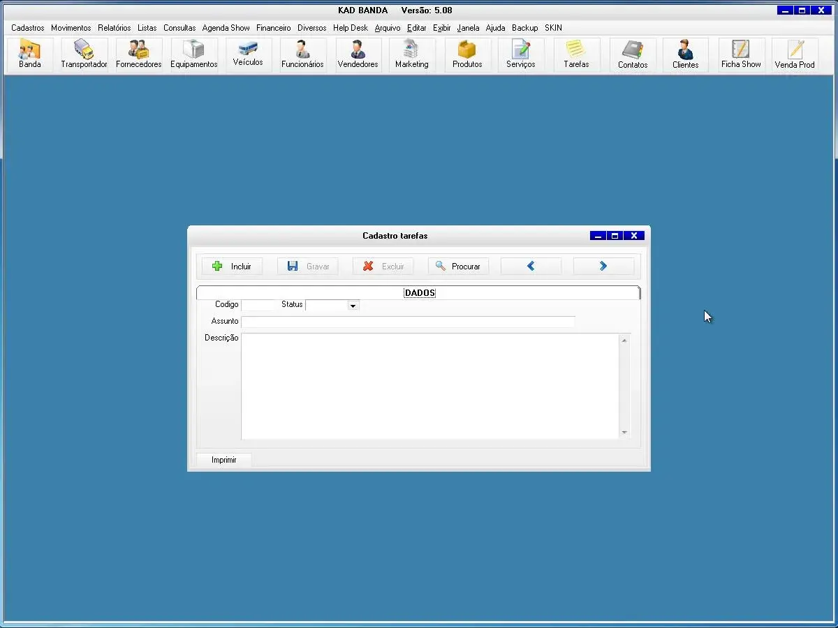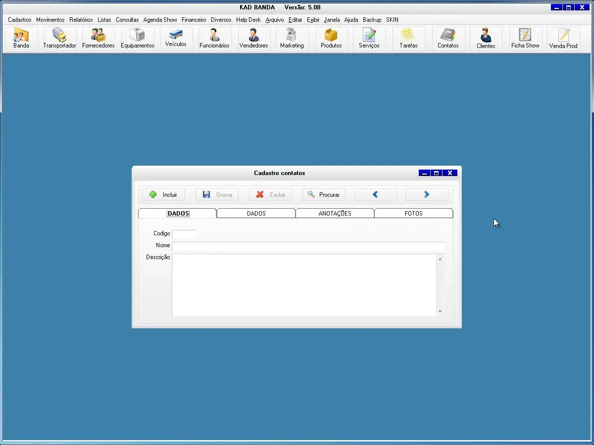 banda, equipamentos, transportadoras, fornecedores, veículos, funcionários, vendedor, marketing, produtos, serviços, tarefas, contatos, clientes