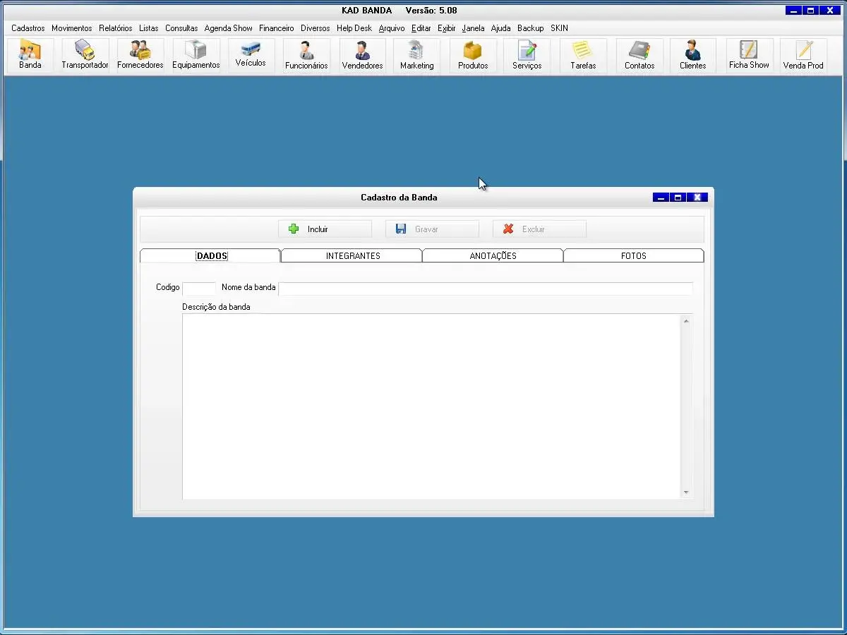 O software para banda possui telas para cadastro da banda e seus integrantes