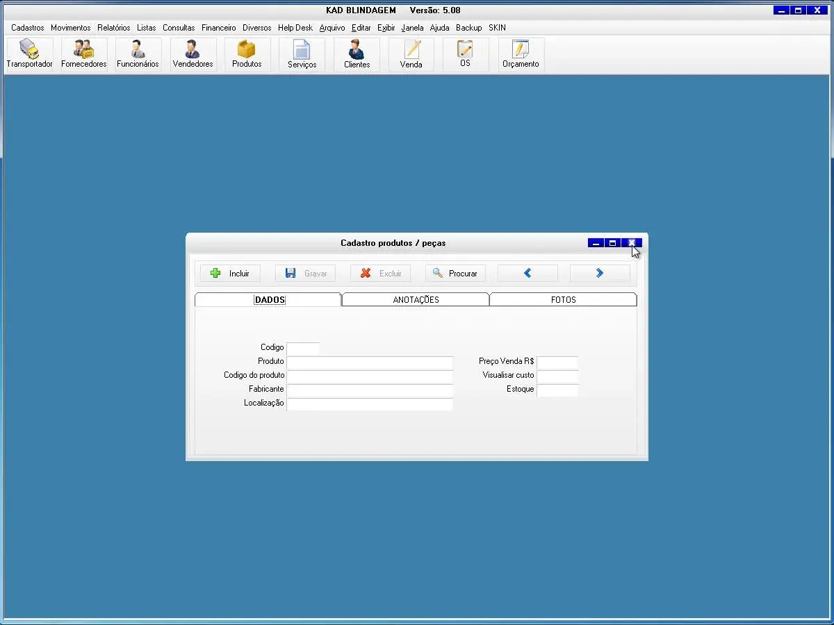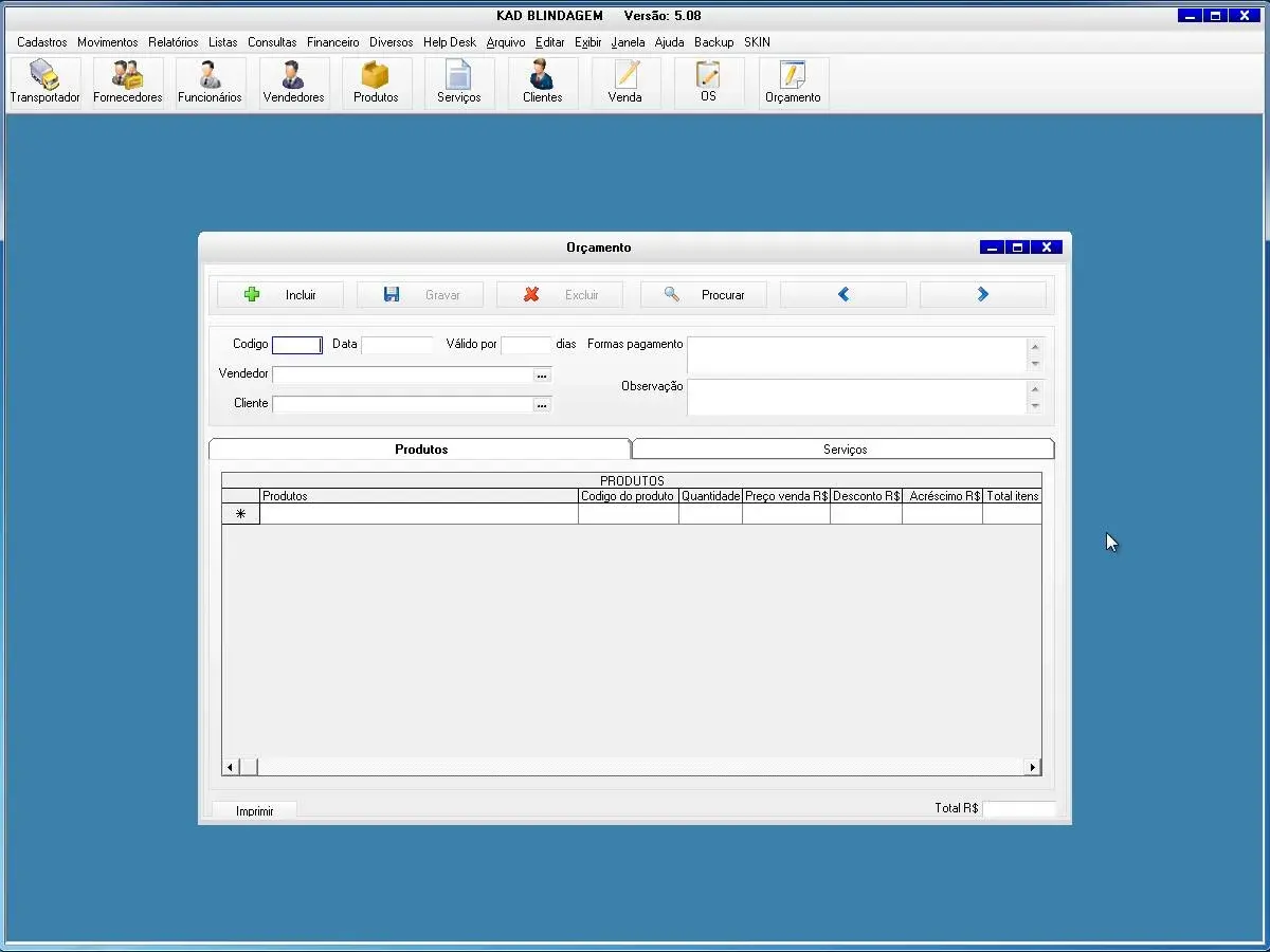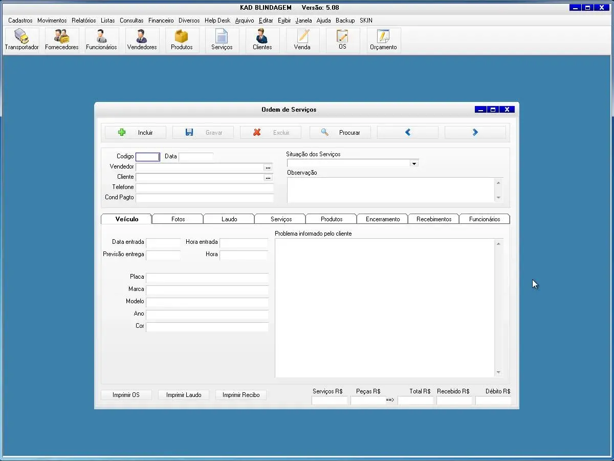 O sistema para blindadora possui cadastro de ordem serviços, vendas e orçamentos
