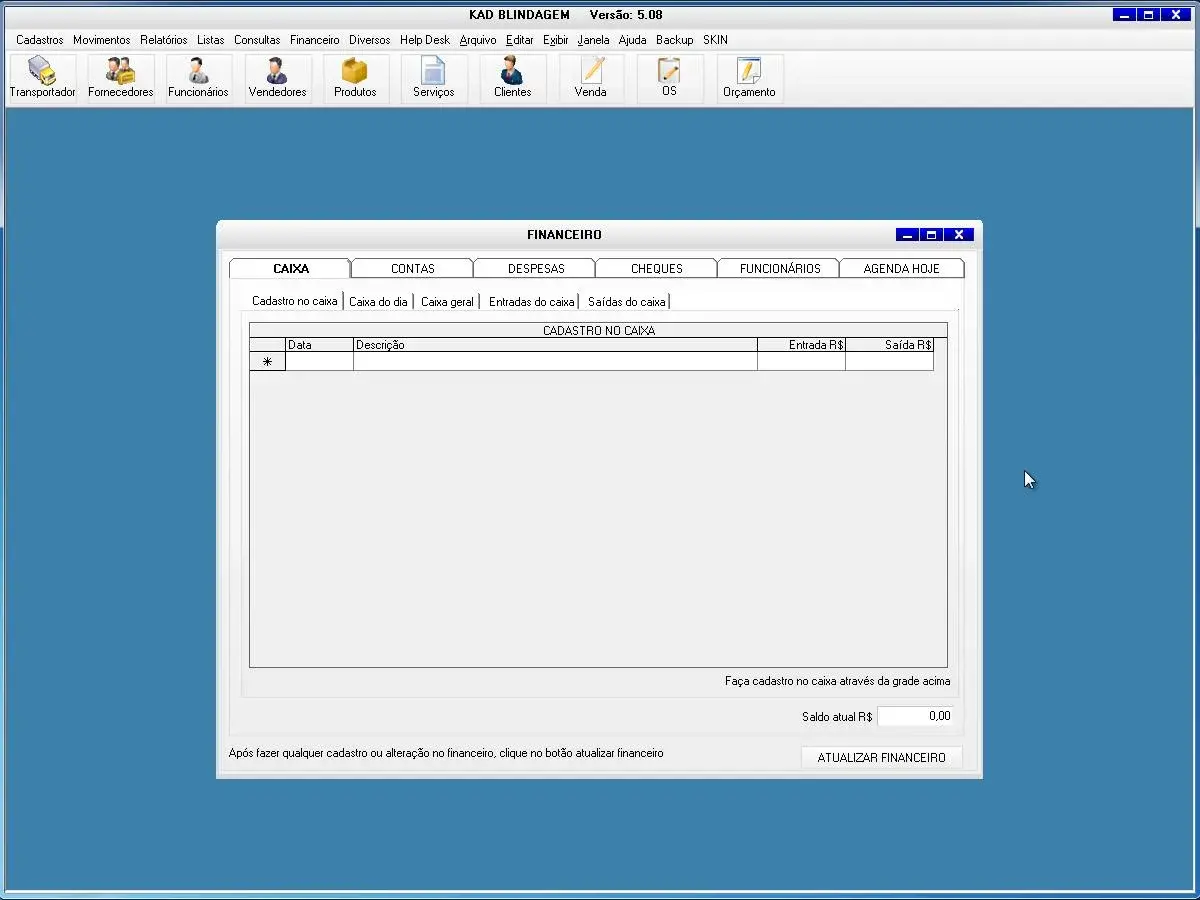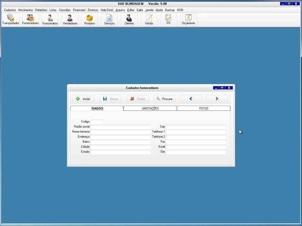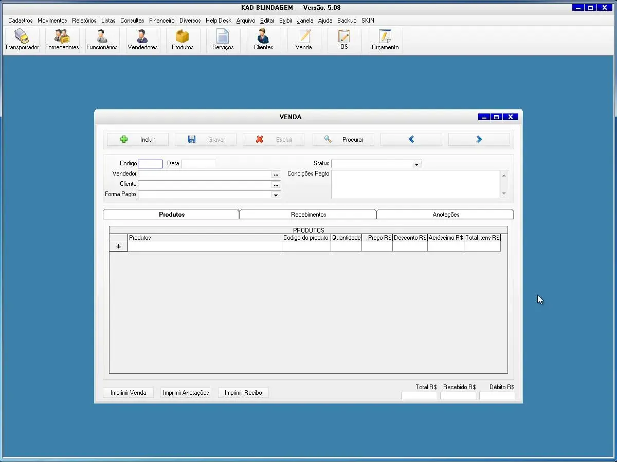 O sistema para blindadora possui cadastro de ordem serviços, vendas e orçamentos