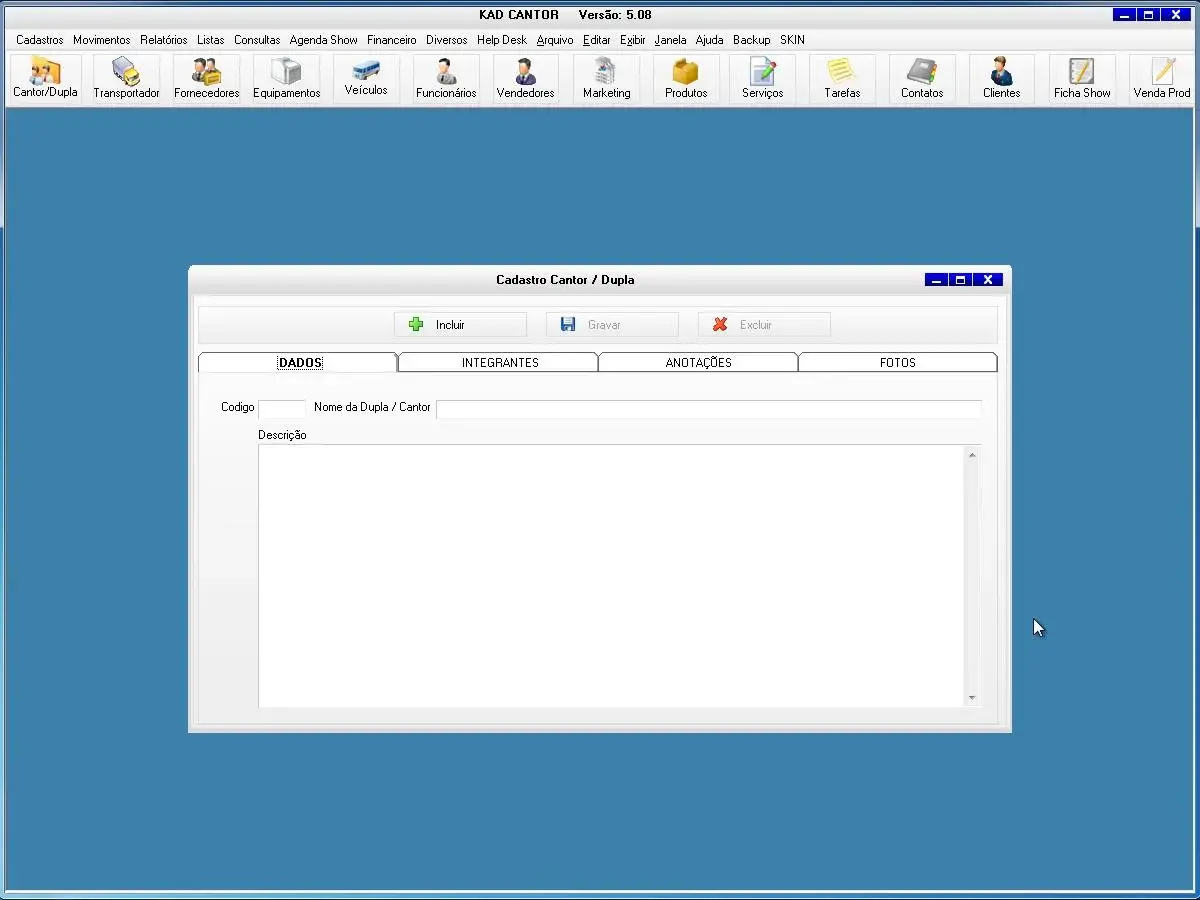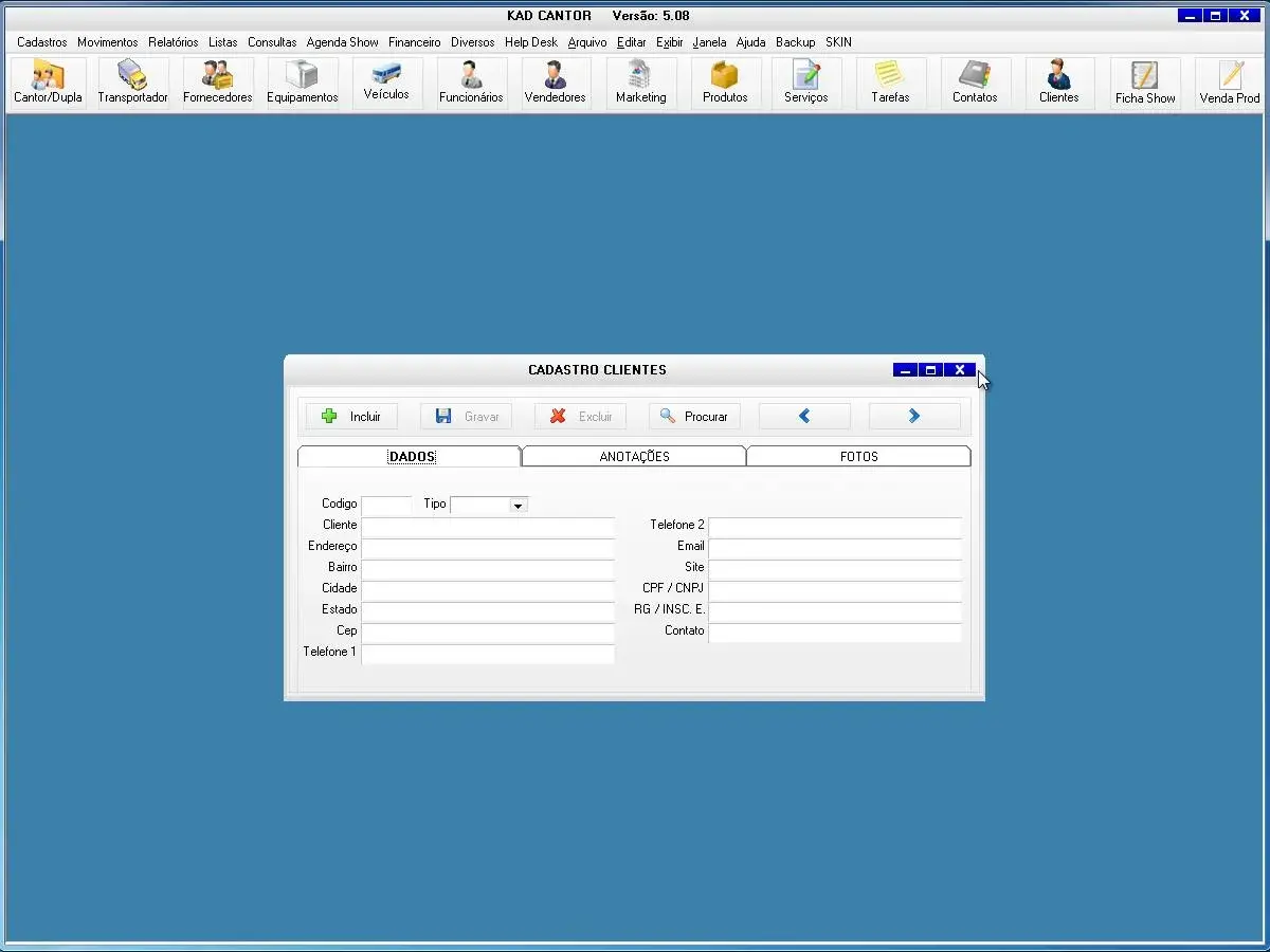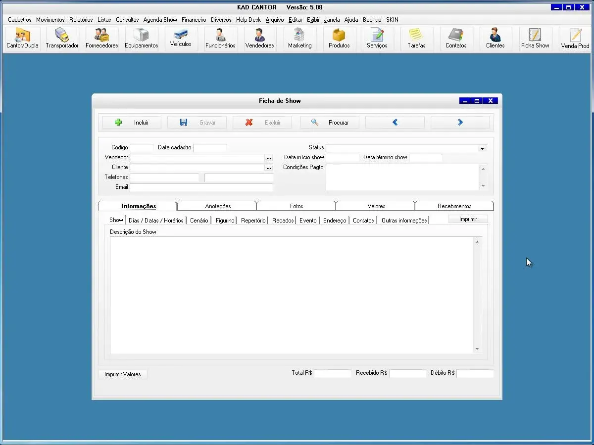 O programa para cantor possui ficha de shows para cadastro de todas as informações dos show e valores