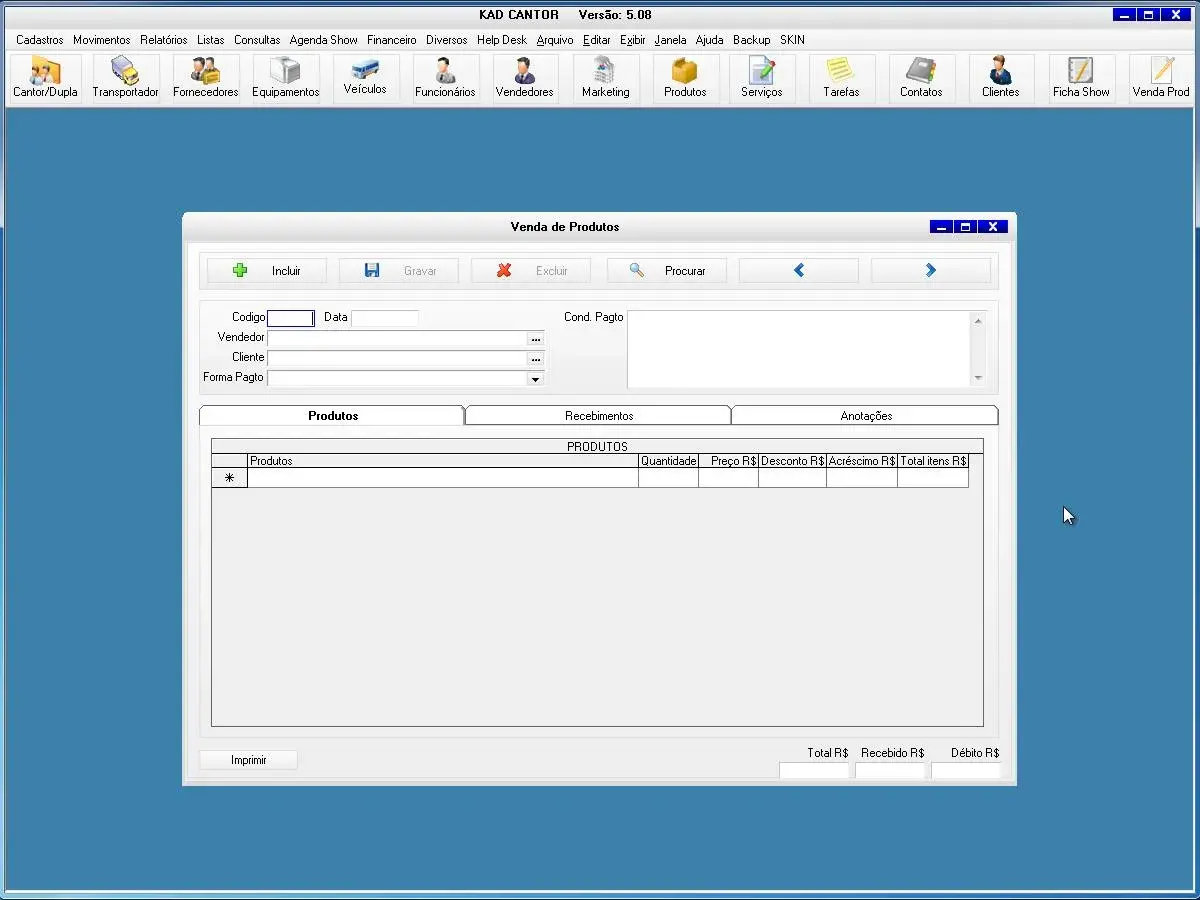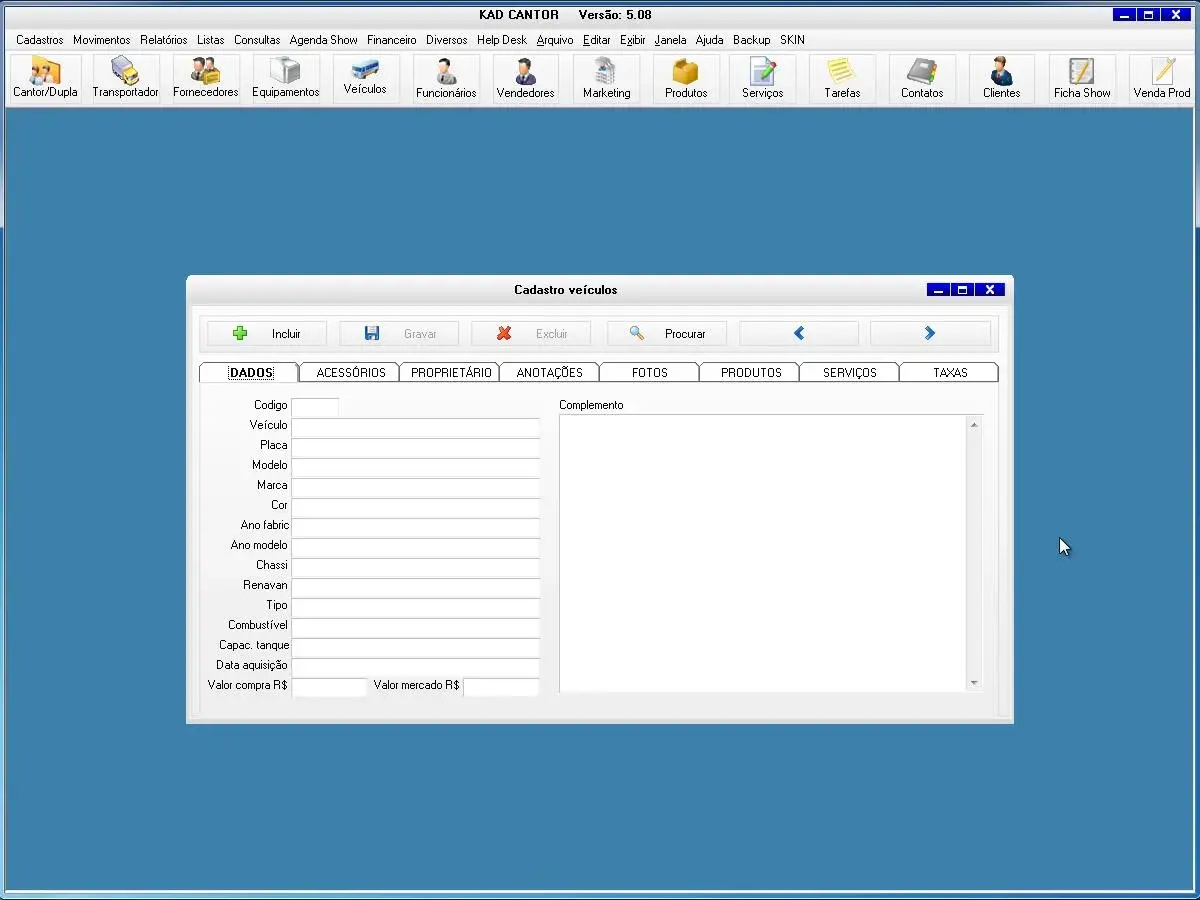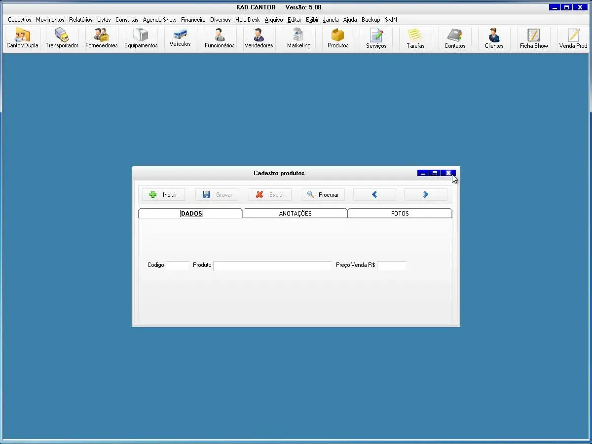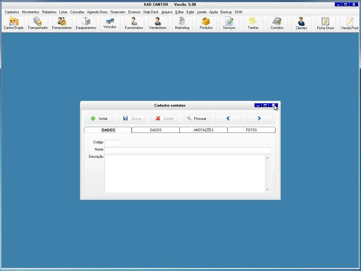 O programa para cantor possui ficha de shows para cadastro de todas as informações dos show e valores