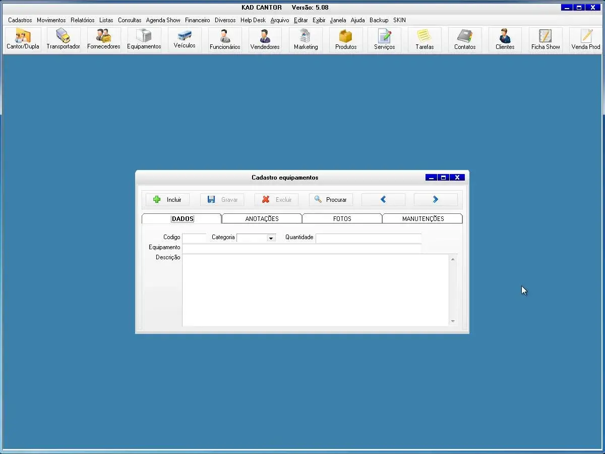 banda, equipamentos, transportadoras, fornecedores, veículos, funcionários, vendedor, marketing, produtos, serviços, tarefas, contatos, clientes