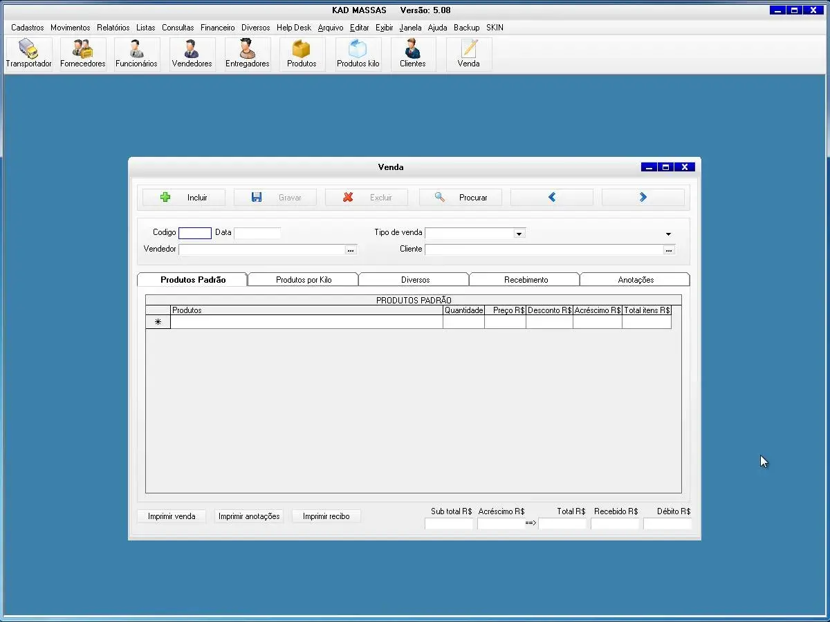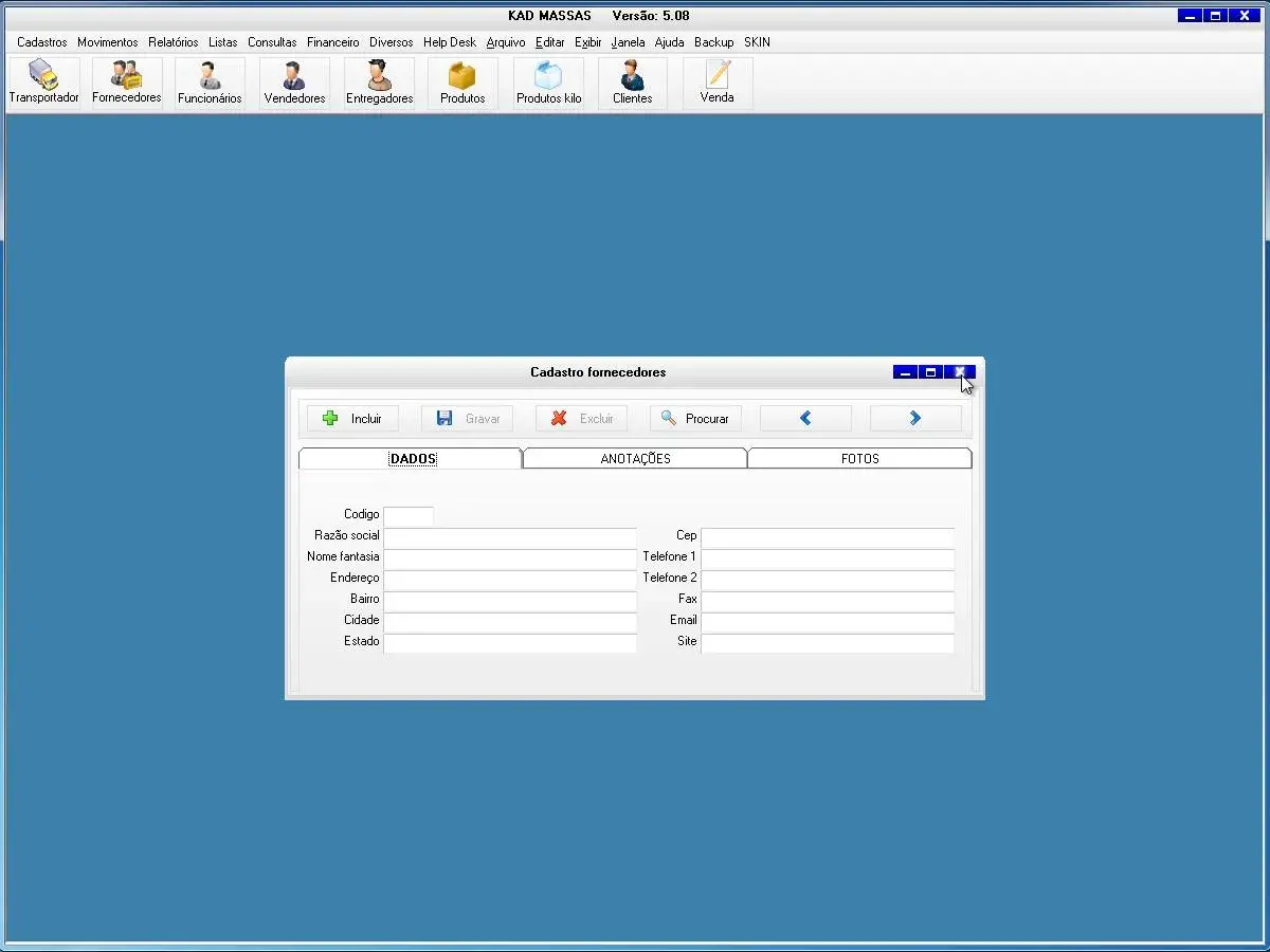 transportadoras, fornecedores, funcionários, vendedor, produtos, produtos por quilo, clientes