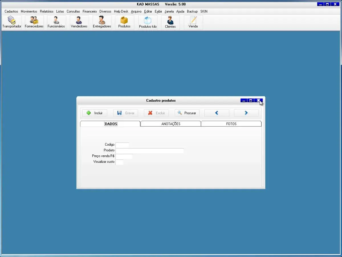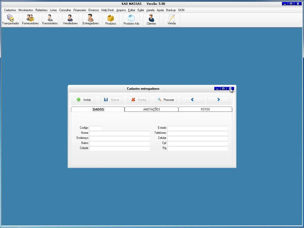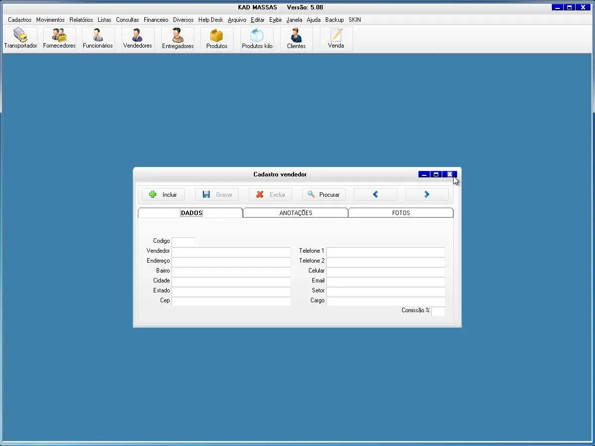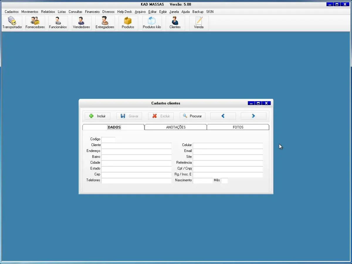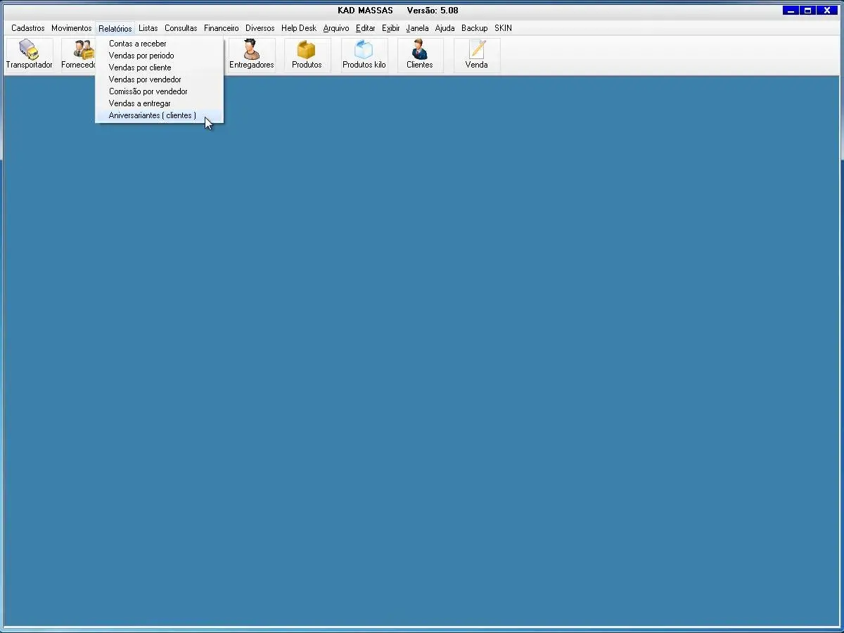 transportadoras, fornecedores, funcionários, vendedor, produtos, produtos por quilo, clientes, clientes aniversariantes