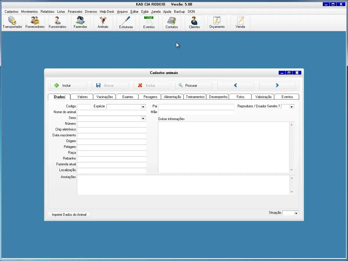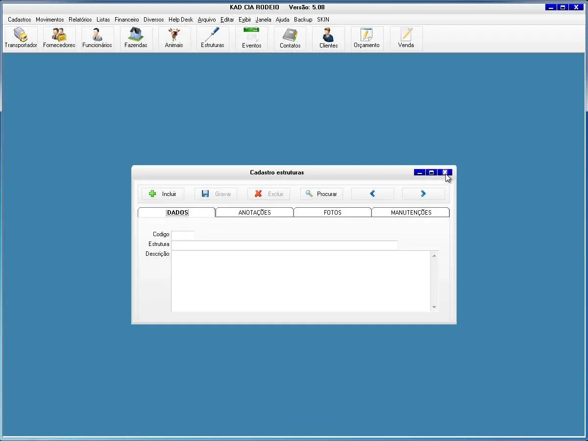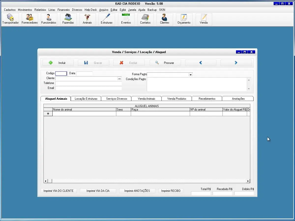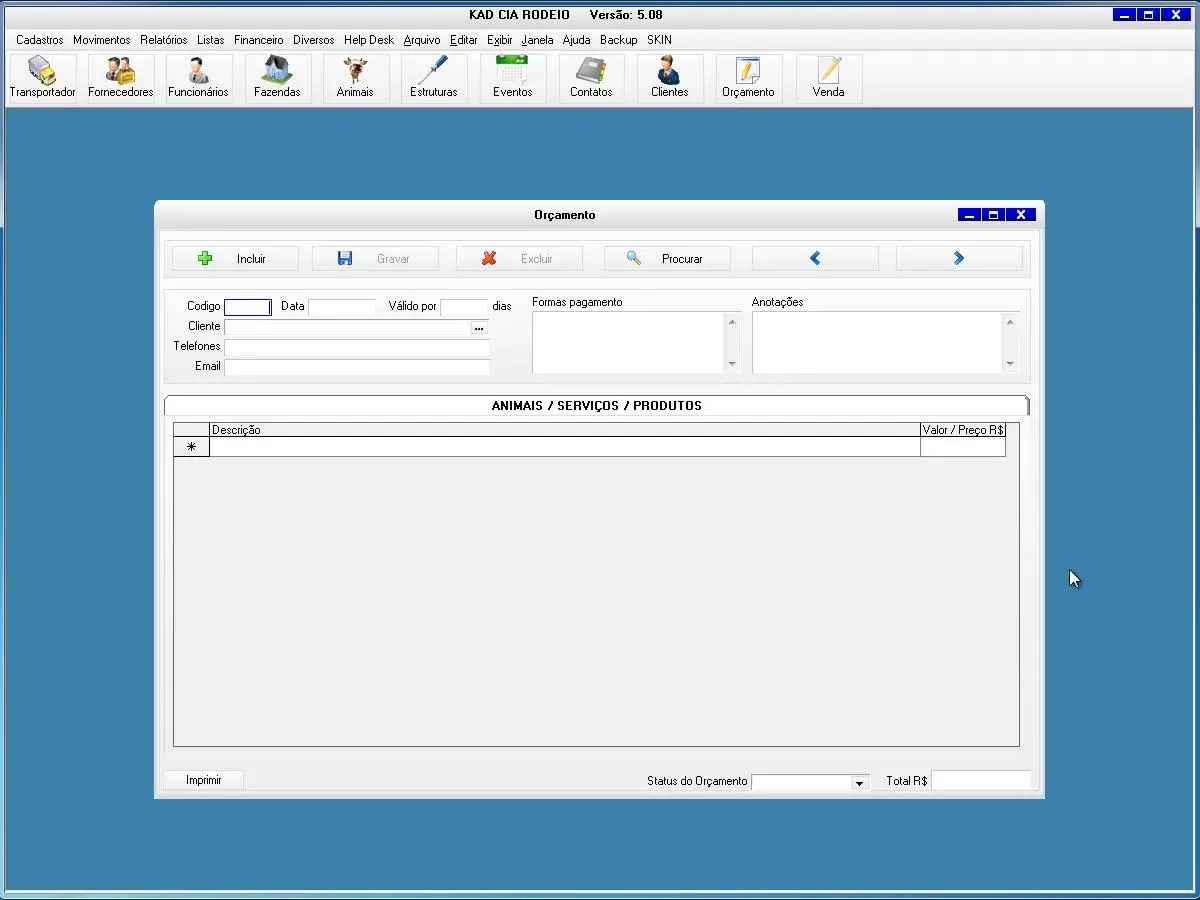O software para cia de rodeio possui cadastro de orçamentos, vendas e locações de animais e estruturas