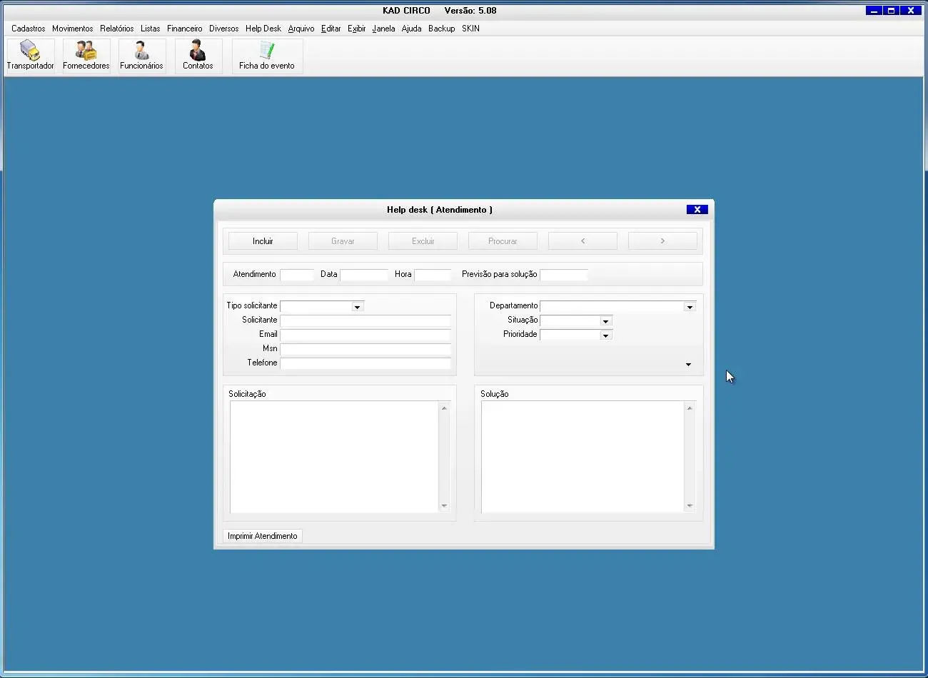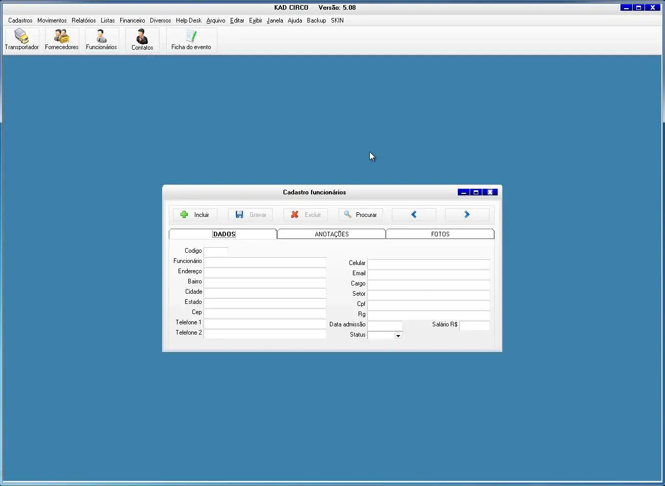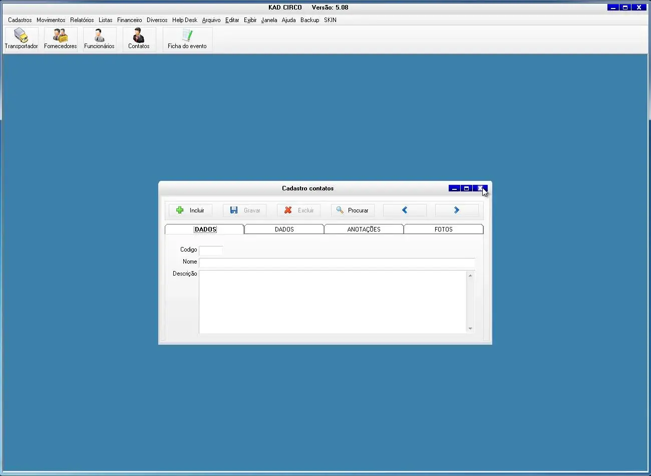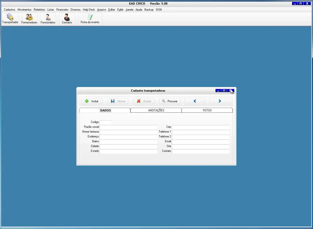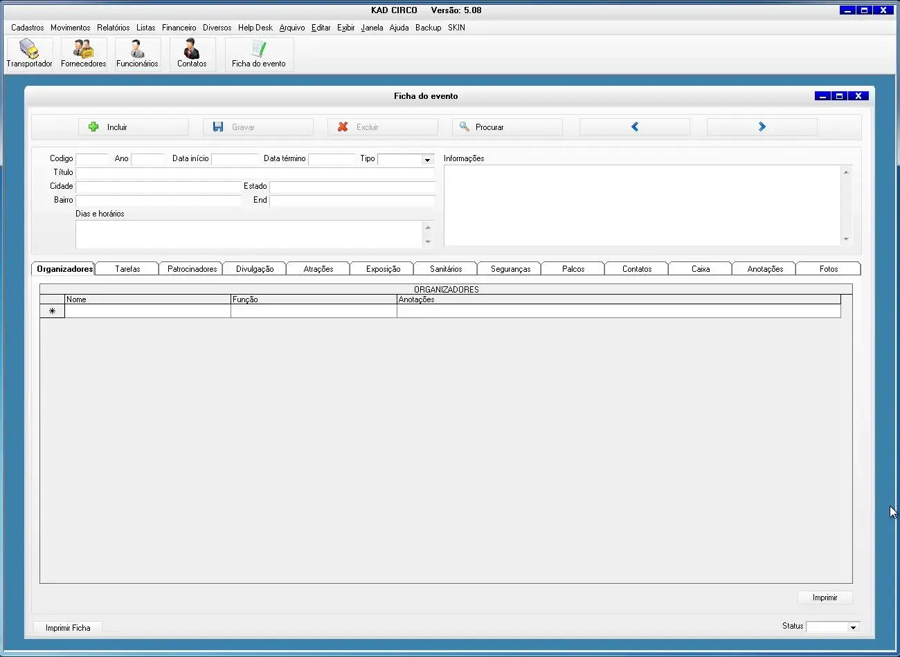 O software para circo possui ficha do evento para cadastro de todas a informações do evento