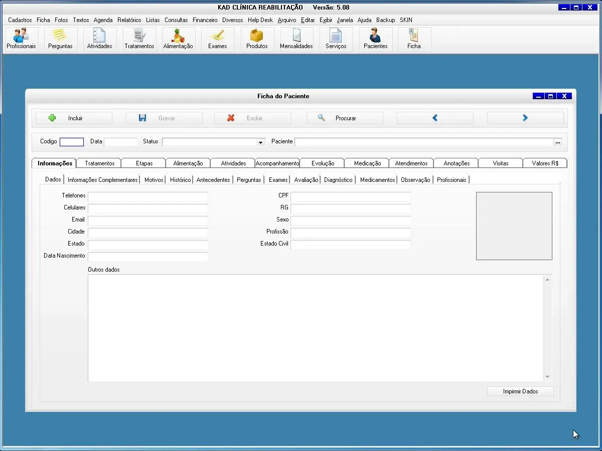 O programa para clínica de recuperação possui ficha do paciente para cadastro de todos os dados importantes