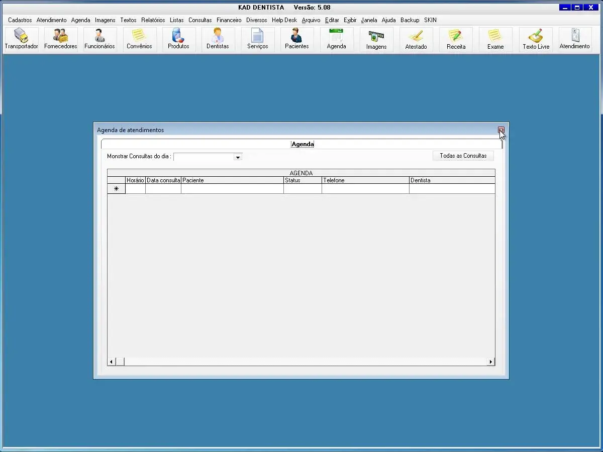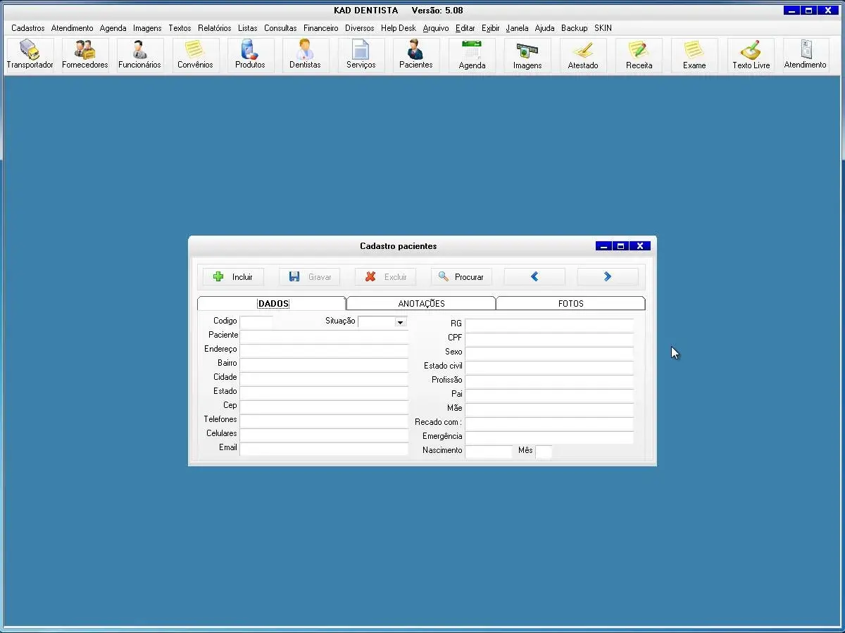 transportadoras, fornecedores, funcionários, convênios, produtos, dentistas, serviços, pacientes