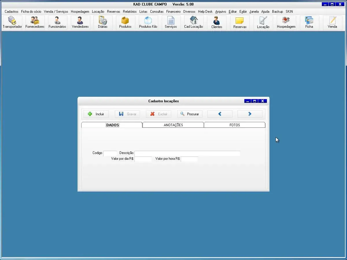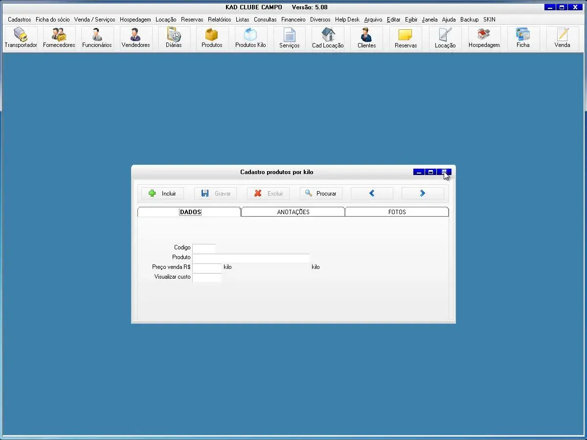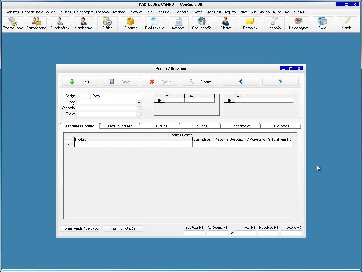 transportadoras, fornecedores, funcionários, vendedores, diárias, produtos, produtos por kilo, serviços, locações, clientes, mesas, garçons