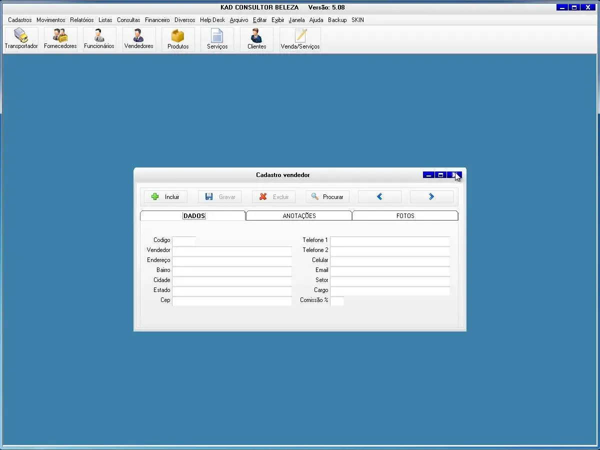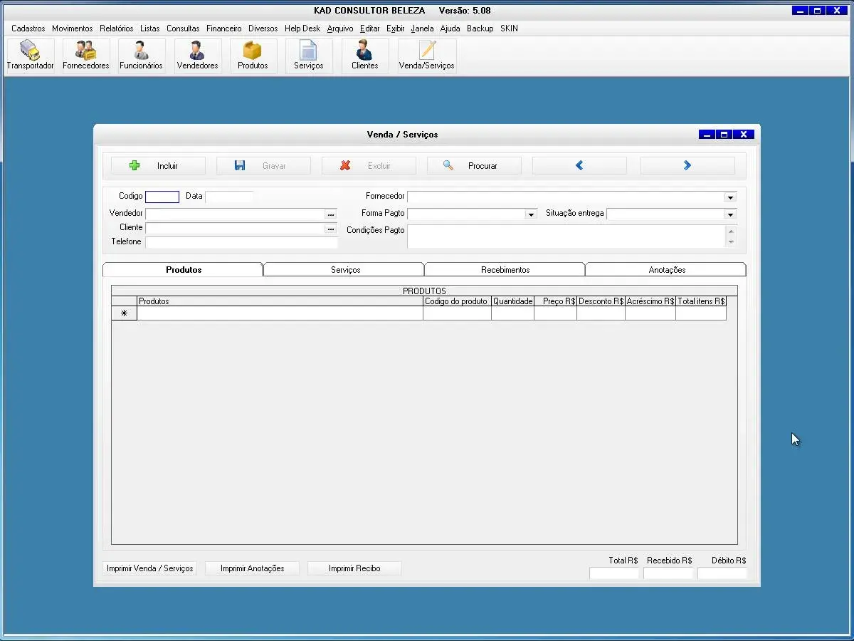 O programa para consultor de beleza possui cadastros de vendas, serviços e orçamentos