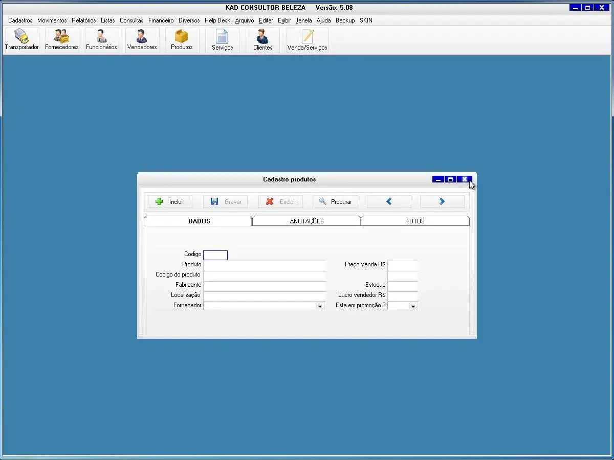 O software para consultor de beleza possui cadastros de produtos, serviços e clientes