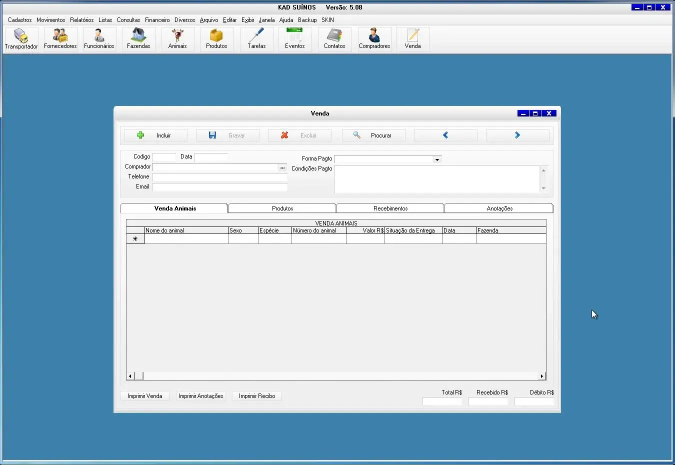 O programa para criador de suínos possui controle de vendas de suínos, carnes e derivados