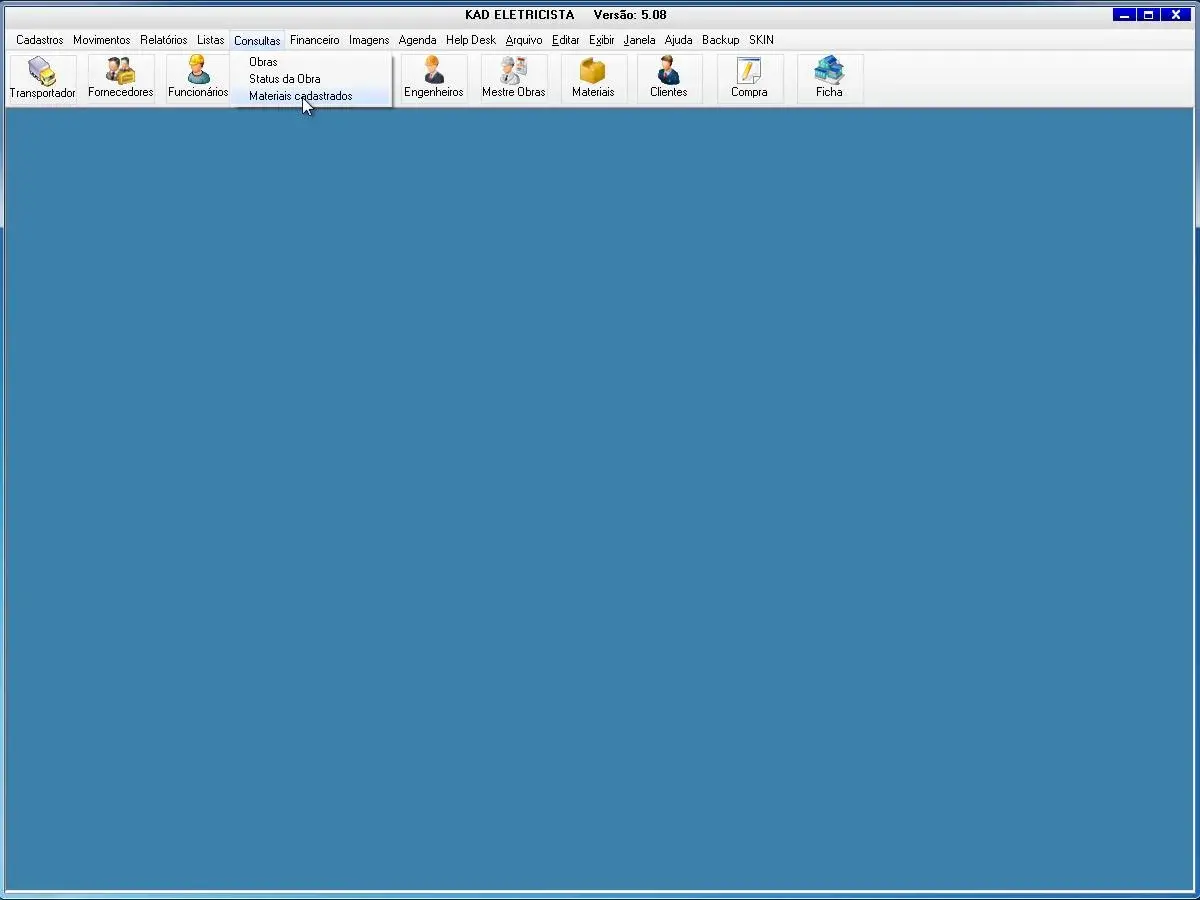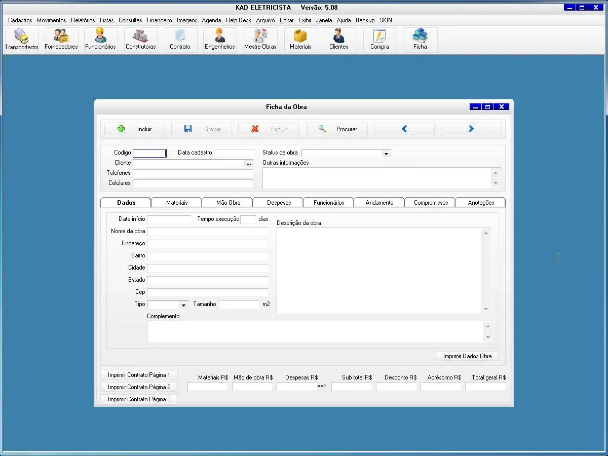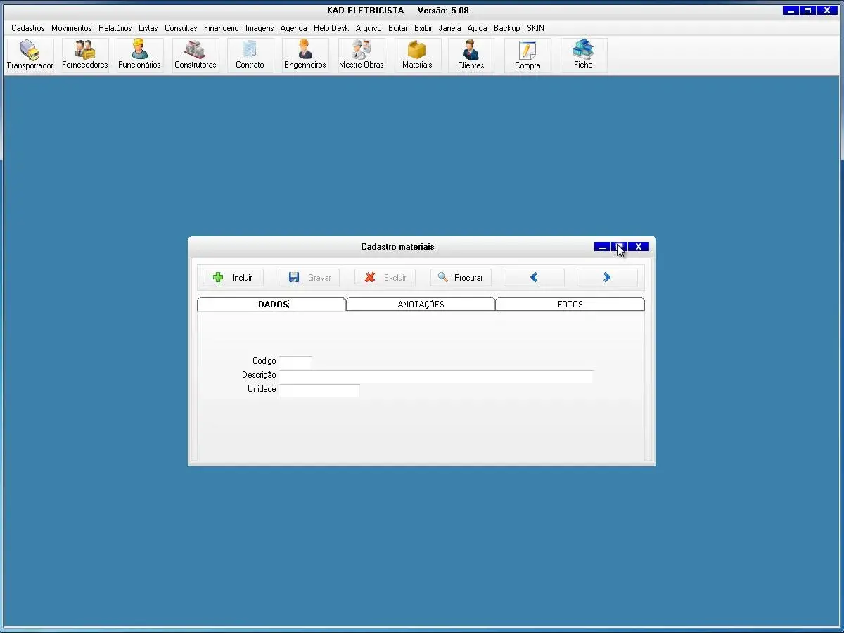 O software para eletricista possui tela para cadastro de materiais e mão obra
