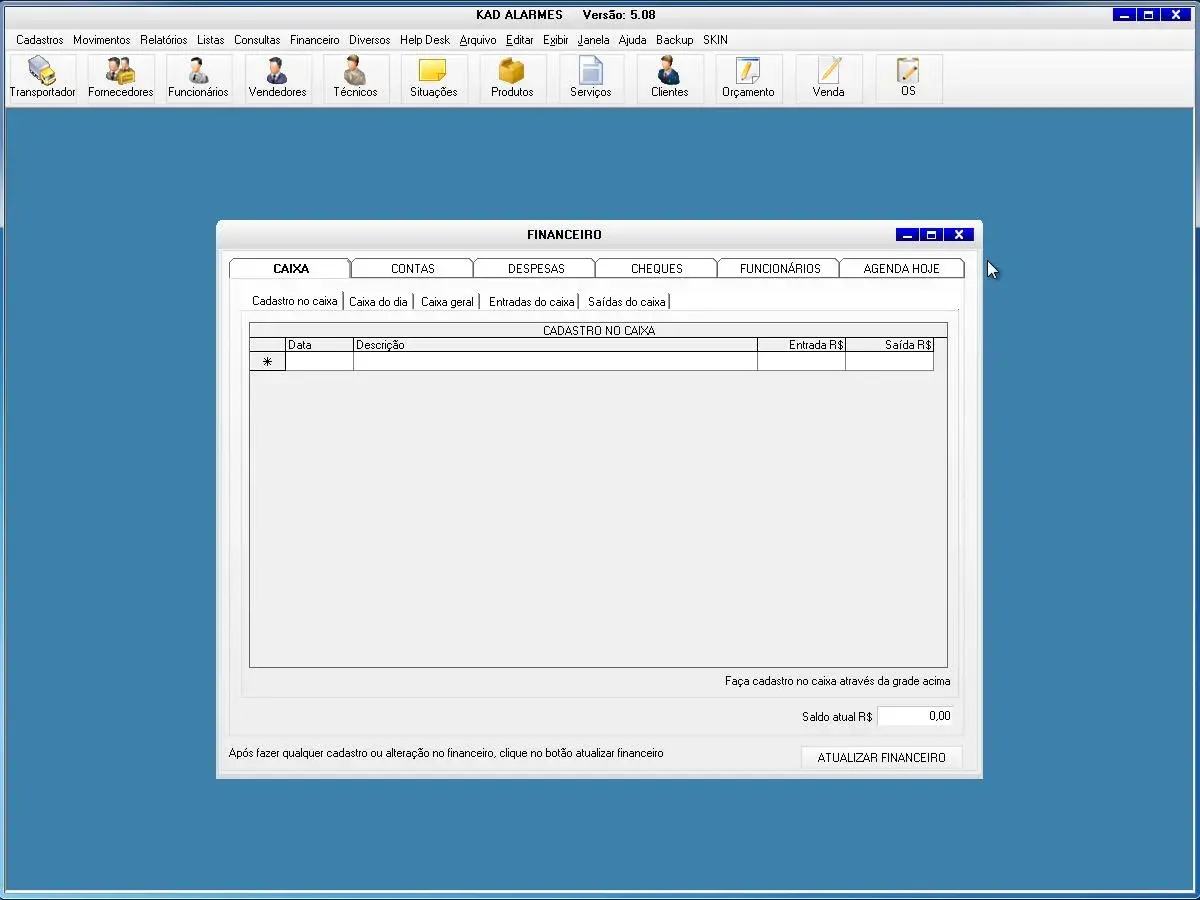 O programa para empresa de alarmes possui controle financeiro