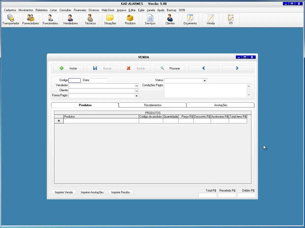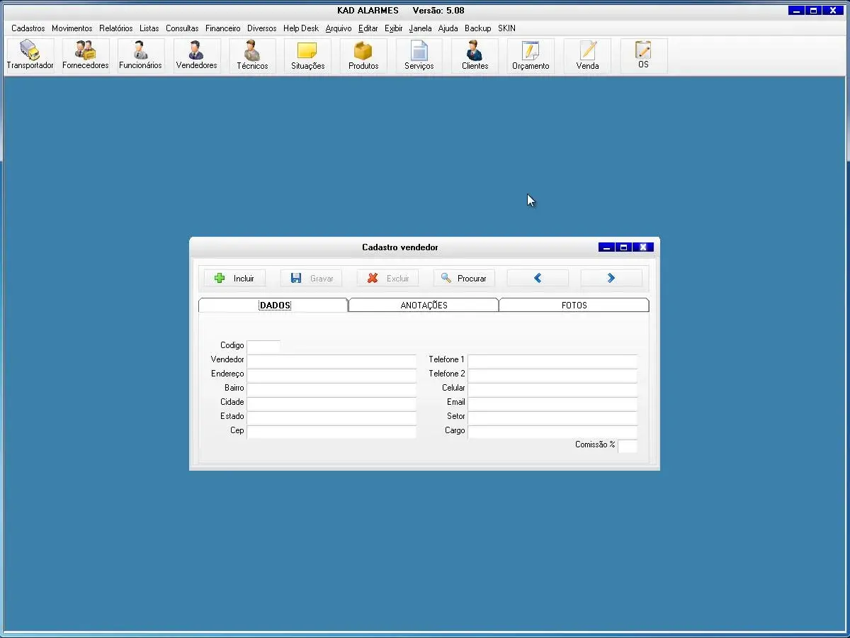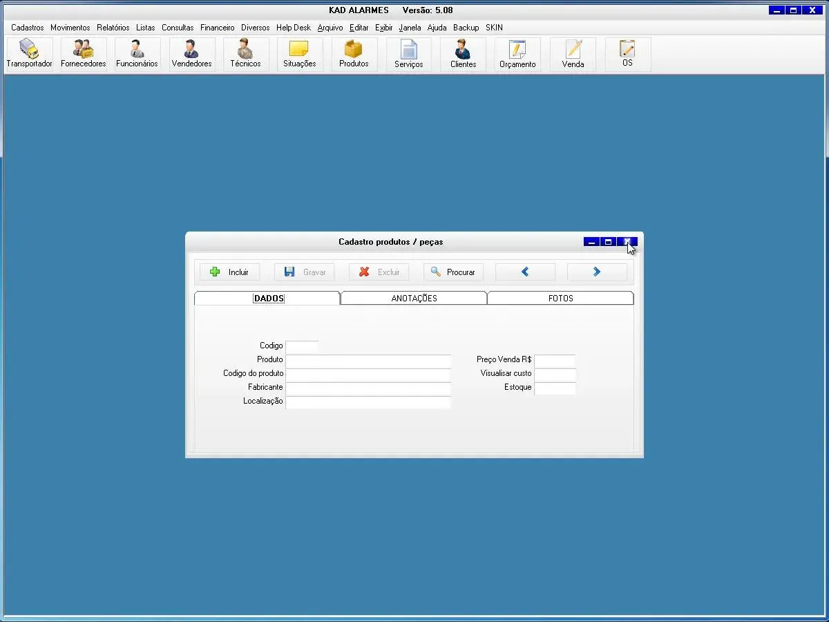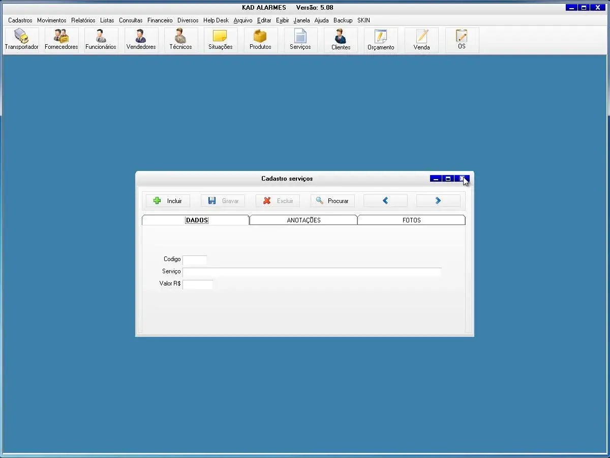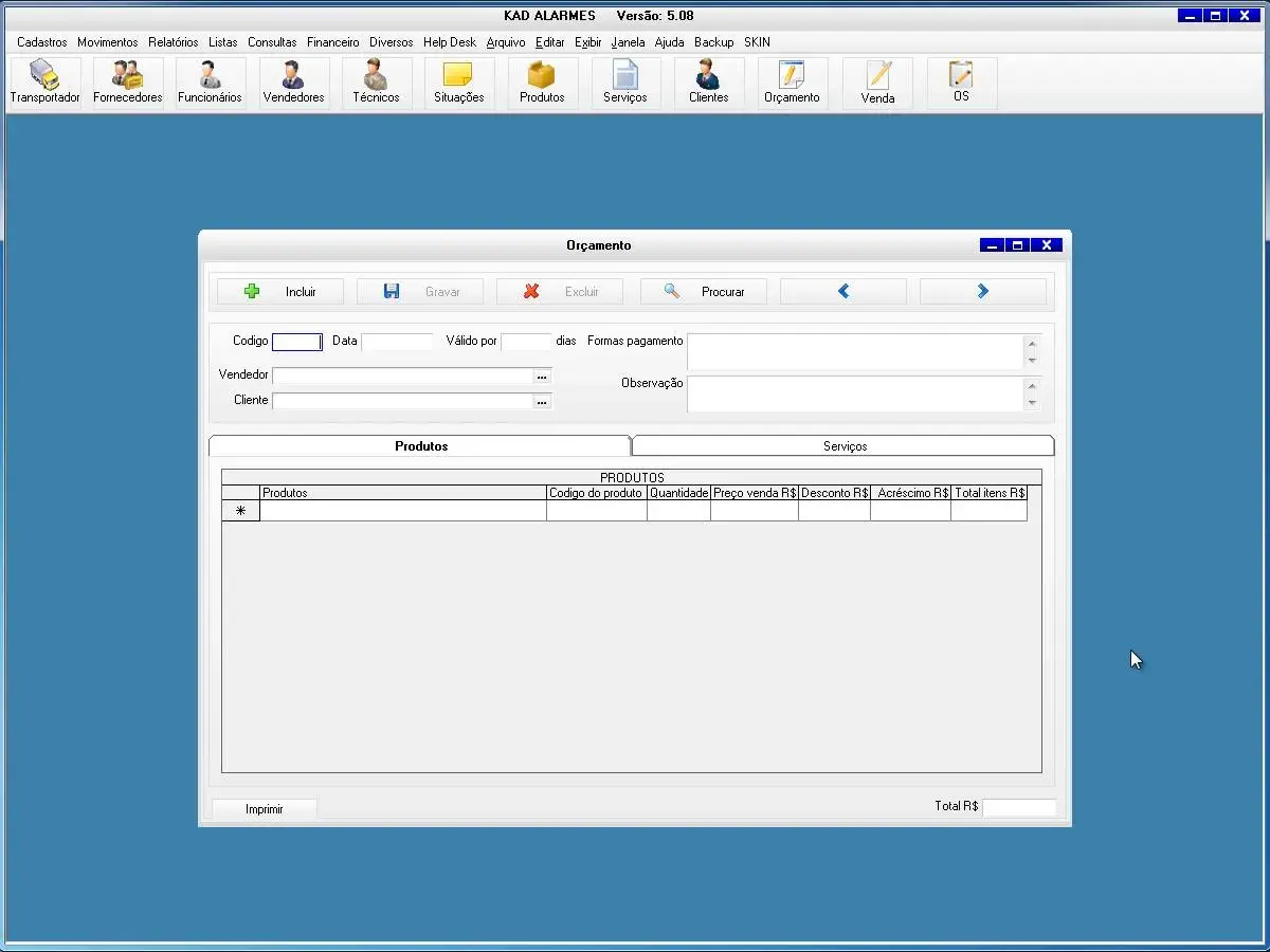 O software para empresa de alarmes possui cadastro de ordem de serviços, vendas e orçamentos