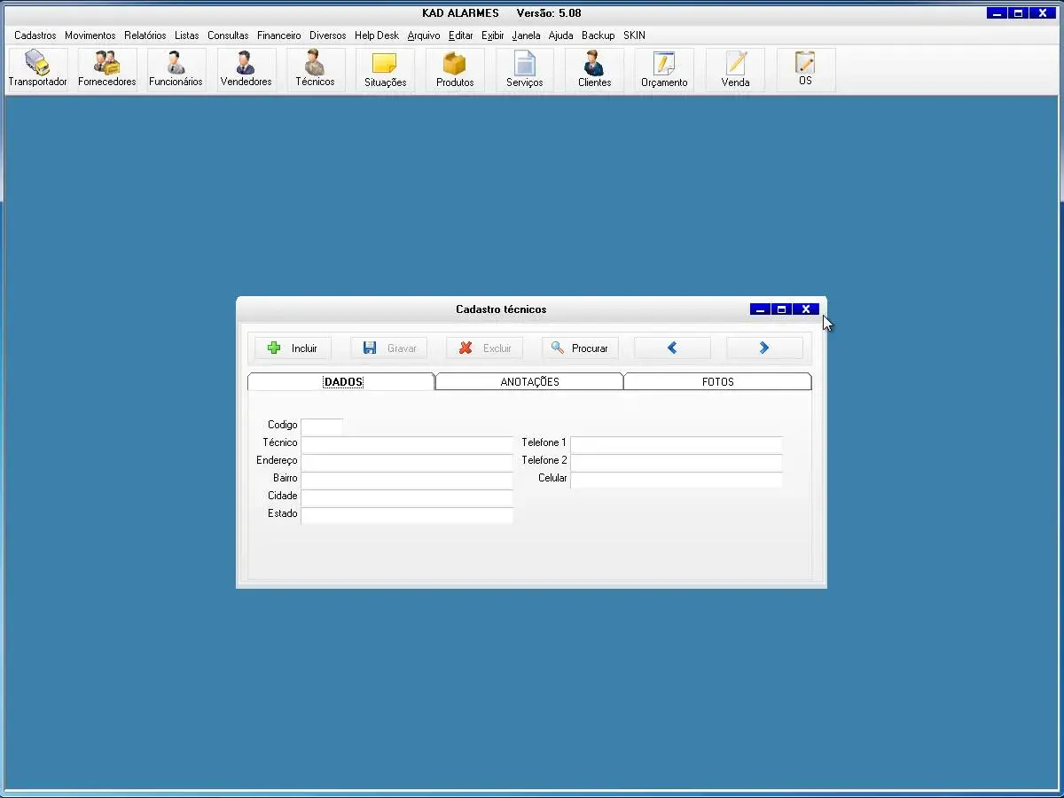transportadoras, fornecedores, funcionários, vendedor, técnico, situação OS, produtos, serviços, clientes