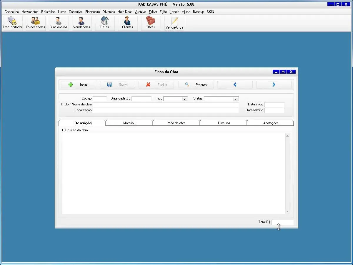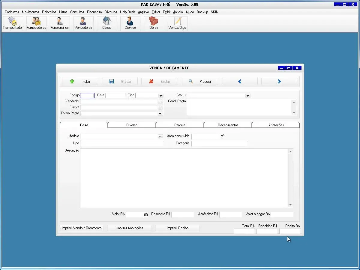 O software para empresa de casas pré-fabricadas possui controle de vendas, orçamentos e obras da construtora