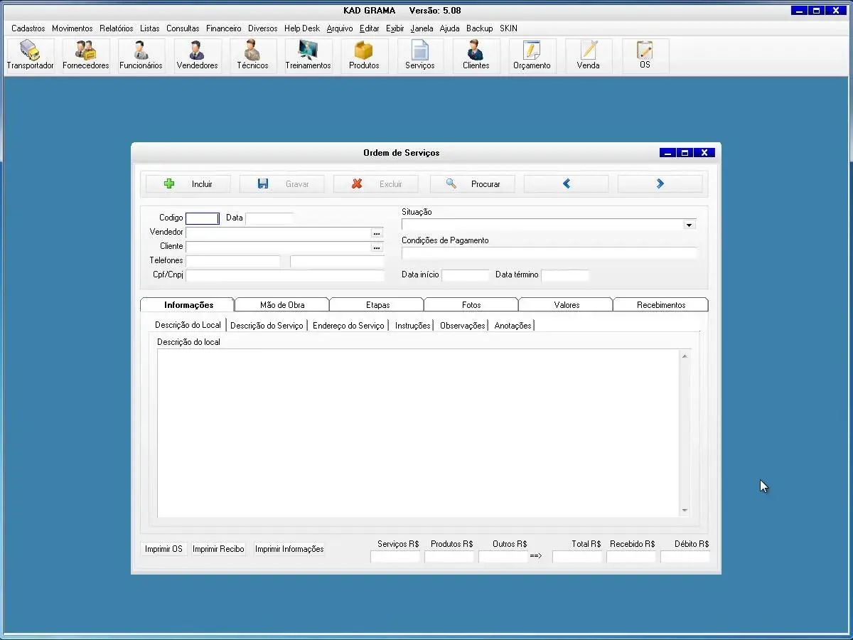 O software para empresa de gramas possui cadastro de ordem de serviços, vendas e orçamentos